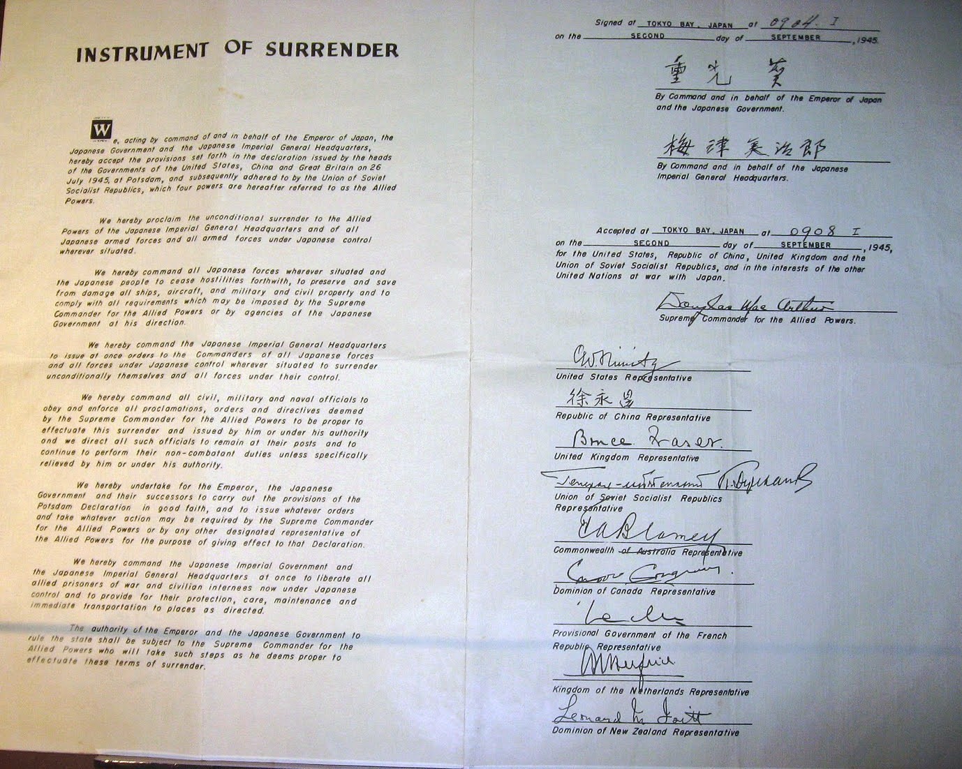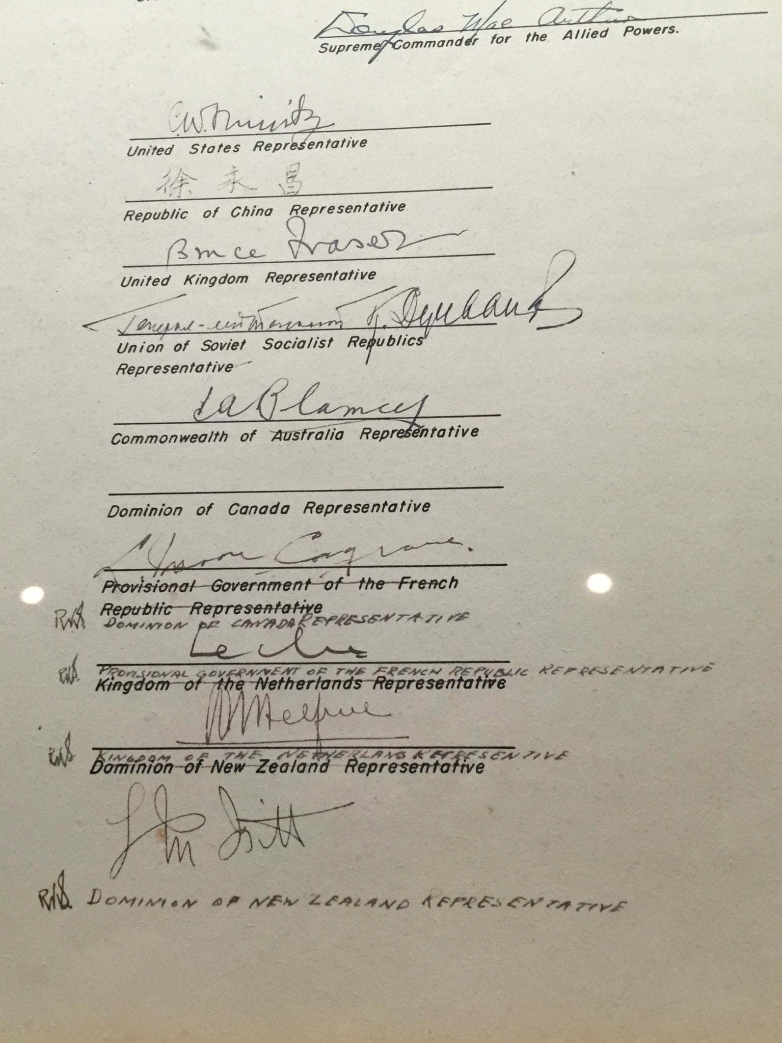 1945年9月2日在东京湾“密苏里号”战列舰上,日本签署了投降书,标志着第二次世界大战的正式结束。日本外相重光葵和日本帝国大本营代表梅津美治郎将军在文件上签字。包括美国、中国、英国、苏联、澳大利亚、加拿大、法国、荷兰和新西兰在内的九个盟国代表作为见证方签字。但轮到加拿大代表劳伦斯·摩尔·科斯格雷夫上校签字时,他不小心将自己的名字签在了法国代表那一栏,导致后面签字的代表们只能集体签错,新西兰代表最后被迫签在空白处。日本代表团对此十分恼火,抗议说他们不能接受一份有瑕疵的文件。最后麦克阿瑟的参谋长萨瑟兰中将说:“坐下,划掉盟军代表的打印姓名,并在错误的签名下方写上正确的姓名。”为了确保万无一失,萨瑟兰还在每一项更正上都签上了自己的姓名首字母作为确认。最终,日方接受了这份修改后的文件。萨瑟兰后来表示,他觉得“无论如何,不会有什么人看到这份文件,因为它很可能会被埋藏在他们(日本人)最秘密档案的最深处。”在后来签署美方保管的那一份时,加拿大代表改正了错误,签在了正确的位置。图1:日方留存的投降书版本,曾经两次公开展览,可以看到签错的痕迹。图2:加拿大代表劳伦斯·摩尔·科斯格雷夫上校签署时的画面。图3:美方留存的版本。