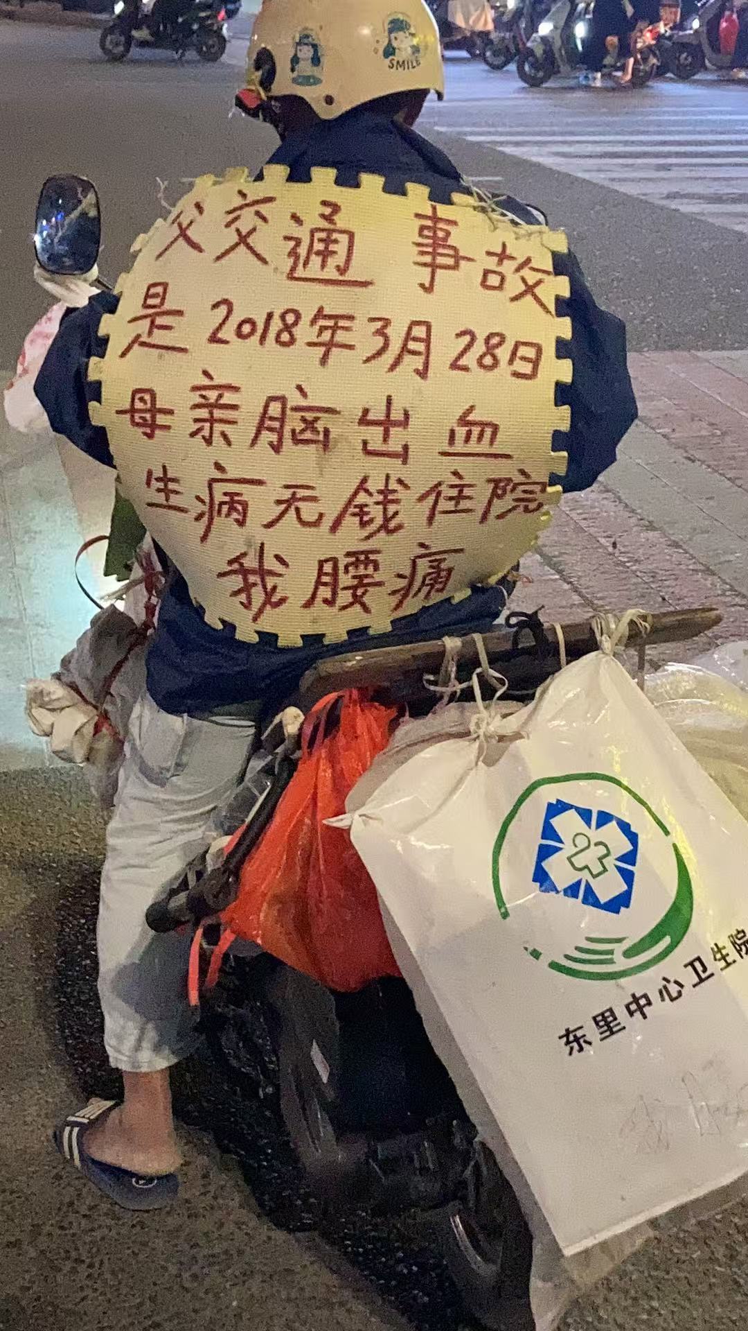 秦岭笑谈 图中男子骑乘电动车,背后用红色字体写着:父交通事故是2018年3月28日母亲脑出血生病无钱住院我腰痛电动车后载有印有“东里中心卫生院”字样的白色袋子,推测地点或为广东省汕头市澄海区东里镇。不知道他发生了什么,未经他人苦,莫劝他人善。是真的有困难,还是一种江湖套路?