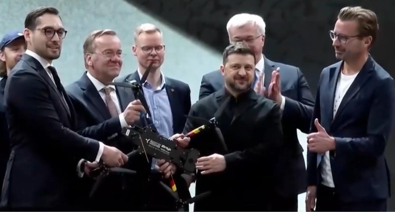 当地时间2月13日,乌克兰总统泽连斯基在德国接收首架德乌联合生产的攻击性无人机。