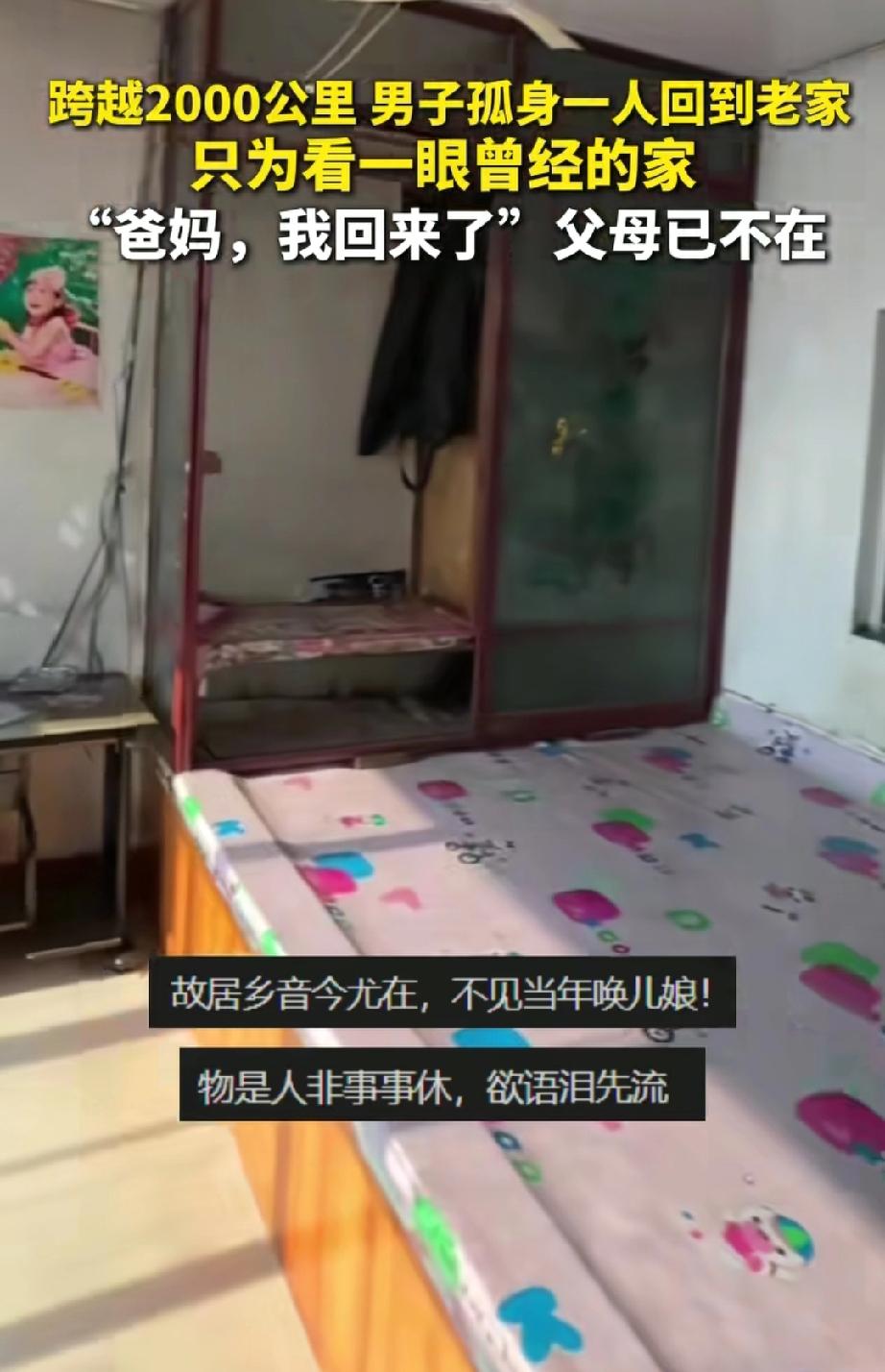 泪目!吉林,一位男子孤身跨越2000公里回到老家,推开家门喊出“爸妈,我回来了”,屋里却只有一片寂静,只因父母早已离世, 故居乡音今尤在,不见当年唤儿娘! 尤先生是吉林人,常年在南方打工,以前每年过年都会回家陪父母,可几年前父母因病相继离开,热闹的家就空了,他也很少再回来。 前几天他做了个梦,梦见父母做了一桌子他爱吃的菜,可伸手去拿,饭菜变成了石头,父母也突然消失,梦醒后他满心伤感,立马跟单位请假,决定回老家看看。 一路奔波近2000公里,他终于到了家门口,推开生锈的院门,院子里长满了膝盖深的枯杂草,再也没有父母收拾的整洁模样。 推开门的那一刻,他习惯性大喊“爸妈,我回来了”,可回应他的只有可怕的安静,再也没有父母出来迎接,没有母亲端来的热乎山药炖排骨。 屋里的陈设他一点都没动,哪怕落满灰尘,也是他留住和父母有关的回忆的唯一方式,看着熟悉的一切,仿佛父母还在身边。 只是院子还是那个院子,灶台还是那个灶台,未烧完的木柴,再也没人喊你吃饭了 有网友说,自己父母也不在了,每年还是会抽空回老家乡下,就坐在老屋门前的石坎上,看看周围的一草一木,回味父母在时的日子,心里就特别踏实 还有网友说,老家的房子早就被推平了,现在只能去父母的坟前坐坐,把开心的、不开心的事都跟他们说说,哪怕他们听不见,心里也能轻松很多。 其实我们都一样,父母在的时候,总觉得回家是理所当然,总说等有空再好好陪伴,可一转眼,就再也没有机会了。 父母在,人生还有来处,不管走多远,都知道有个地方有人等你;父母去,人生就只剩归途,再回家,也只剩空荡荡的屋子和满脑子的回忆。那种喊一声爸妈没人应的滋味,真的太难受了。 尤先生跨越2000公里回的不是一间空屋子,而是刻在骨子里的根,是藏着所有温暖回忆的家,是灵魂的寄托。 这趟回家路,满是思念,也满是遗憾。其实家从来不是一栋房子,而是有父母在的烟火气,是有人疼、有人等的归属感。 珍惜当下,趁父母还在,多回家看看,多打几个电话,多一点陪伴,别让“子欲养而亲不待”成为这辈子最遗憾的事。 父母健在,能有一声爸妈喊就是这辈子最珍贵的福气,别等失去了,才想起好好爱他们。