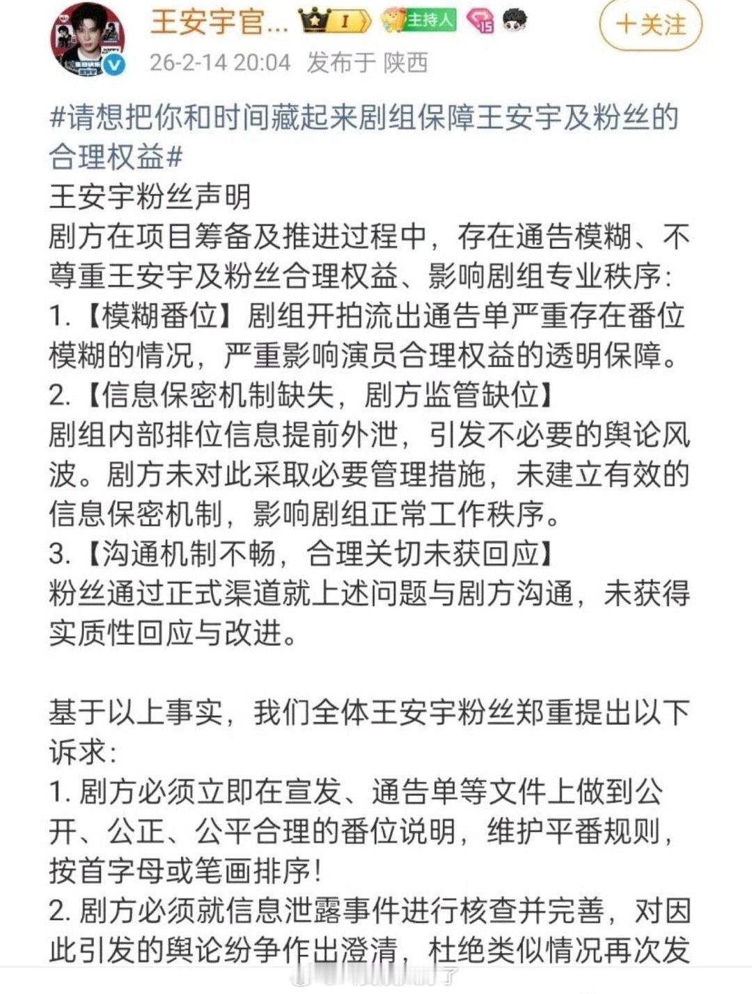 王安宇粉丝向《想把你和时间藏起来》剧组维权,看起来是因为番位问题?