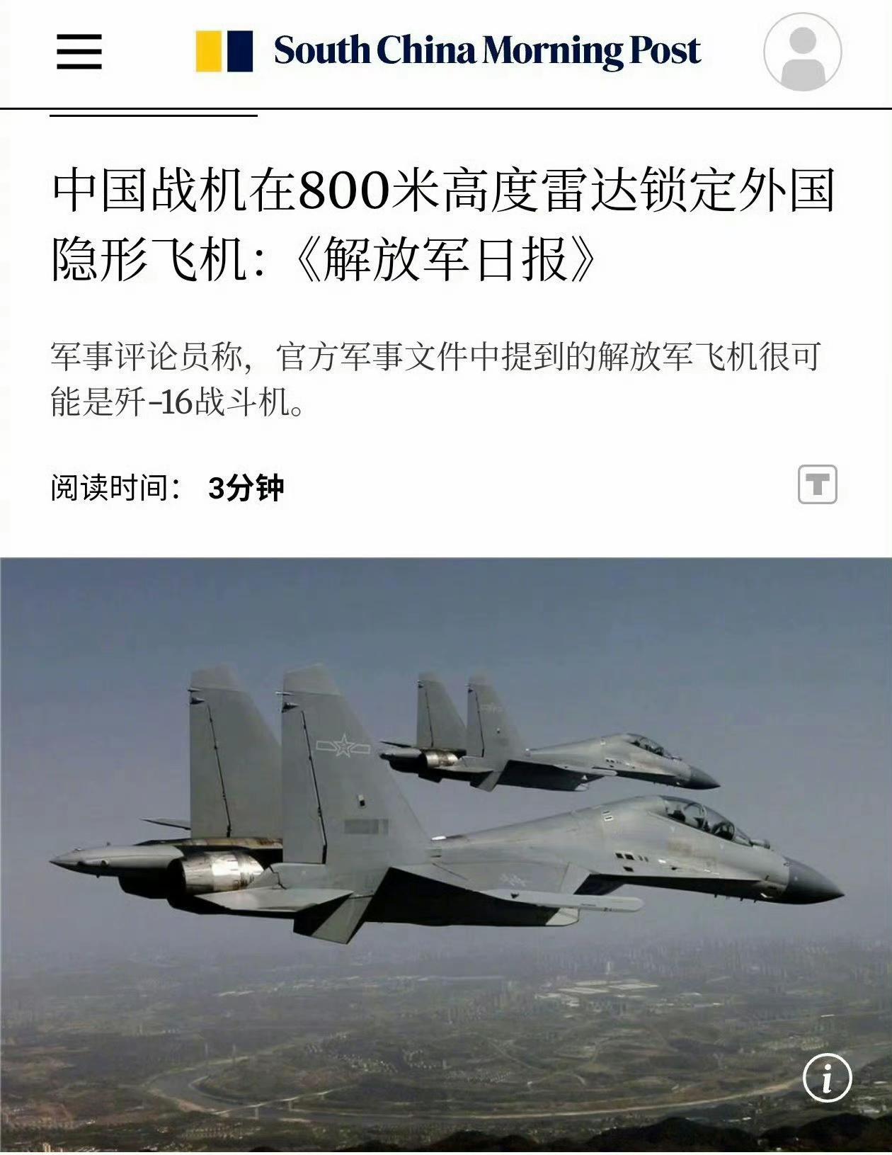 外媒:东大战斗机在800米距离用雷达锁定外军隐形飞机 [灵光一闪] 疑似是J-16一锁二F-22的那次,之后F-22就再也没来东大近海了 [偷笑]