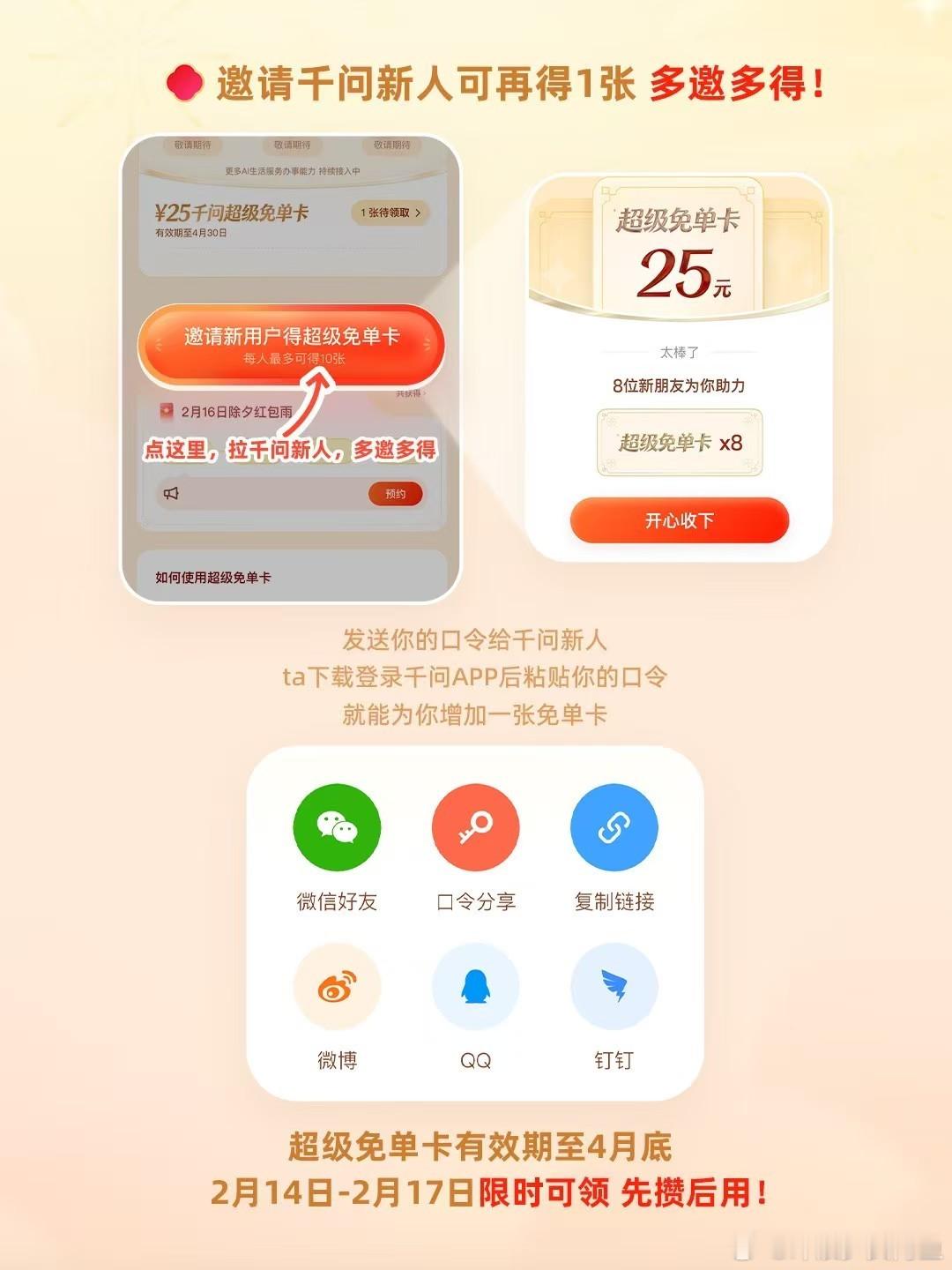 情人节发现男朋友联系高中女同学今年情人节最反转的剧情被我遇上了,本来还暗自emo,结果发现男友联系老同学,全是为了薅千问的免单卡福利,25元无门槛直接抵用,邀请新用户就能多拿,实用性这一块直接拿捏了!谁懂奶茶、美食、电影票、门票全都能用的快乐,有效期还长,囤着慢慢用超安心,与其纠结小事,不如一起快乐薅羊毛,情人节的快乐就是这么简单又实在!