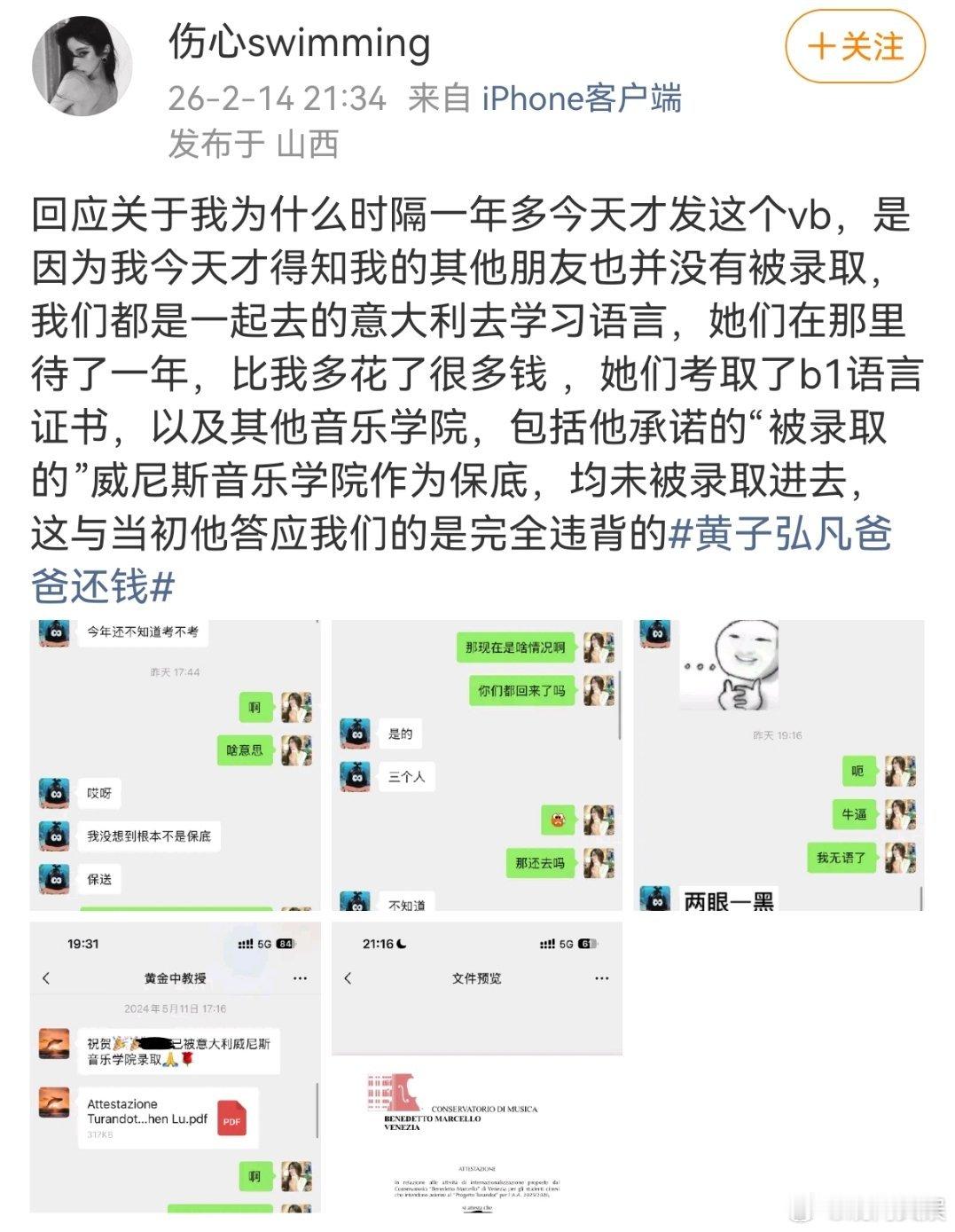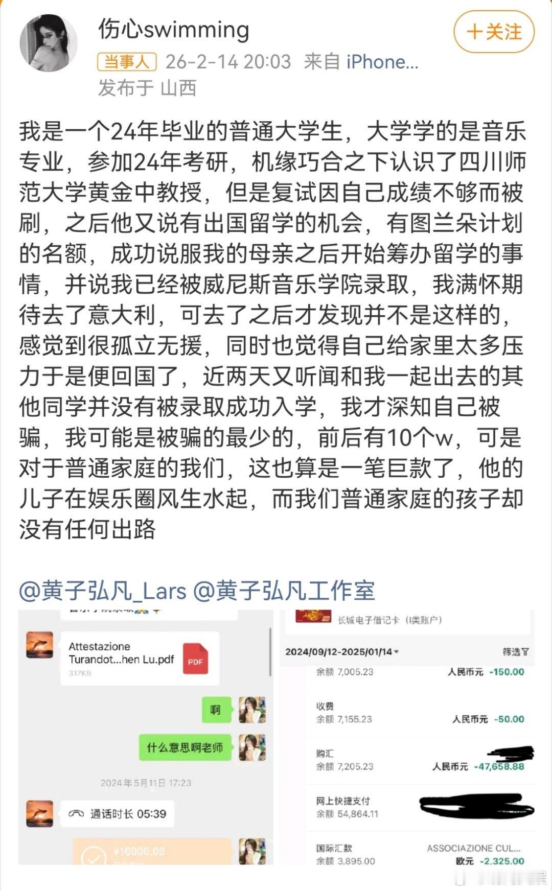 黄子弘凡方回应爆料 14日,有网友曝黄子弘凡爸爸诈骗学生,称自己被黄子弘凡父亲打着“内部名额、保录取”的旗号,收取巨额费用,但不办事,网友称以为能被国外学校录取,为此给黄子弘凡爸爸前后打款超过10万,结果并没有录取,并表示不止自己一个受害者。