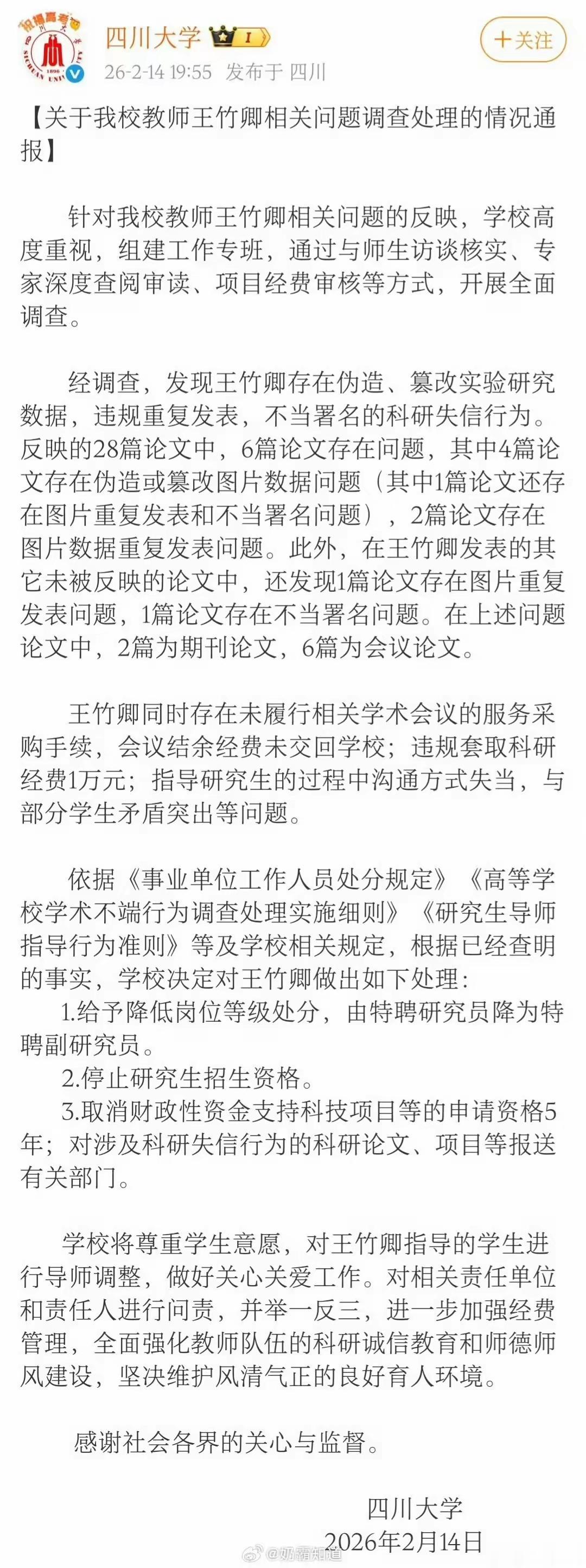 川大关于王竹卿的处理结果终于出来了,联名举报内容居然属实。但让人意外的是这位全家都在日本并且本人媚日严重的“引进人才”,居然被“保”了下来没有被开除。 像这样的人,都已经犯下如此之多的错误了而且意识形态极其不良,那么还把他留在我国高等学府的意义是什么呢? 是想让他继续向我国莘莘学子洗脑日本第一吗?谁在默默的罩着这家伙,能不能自己站出来露个脸?