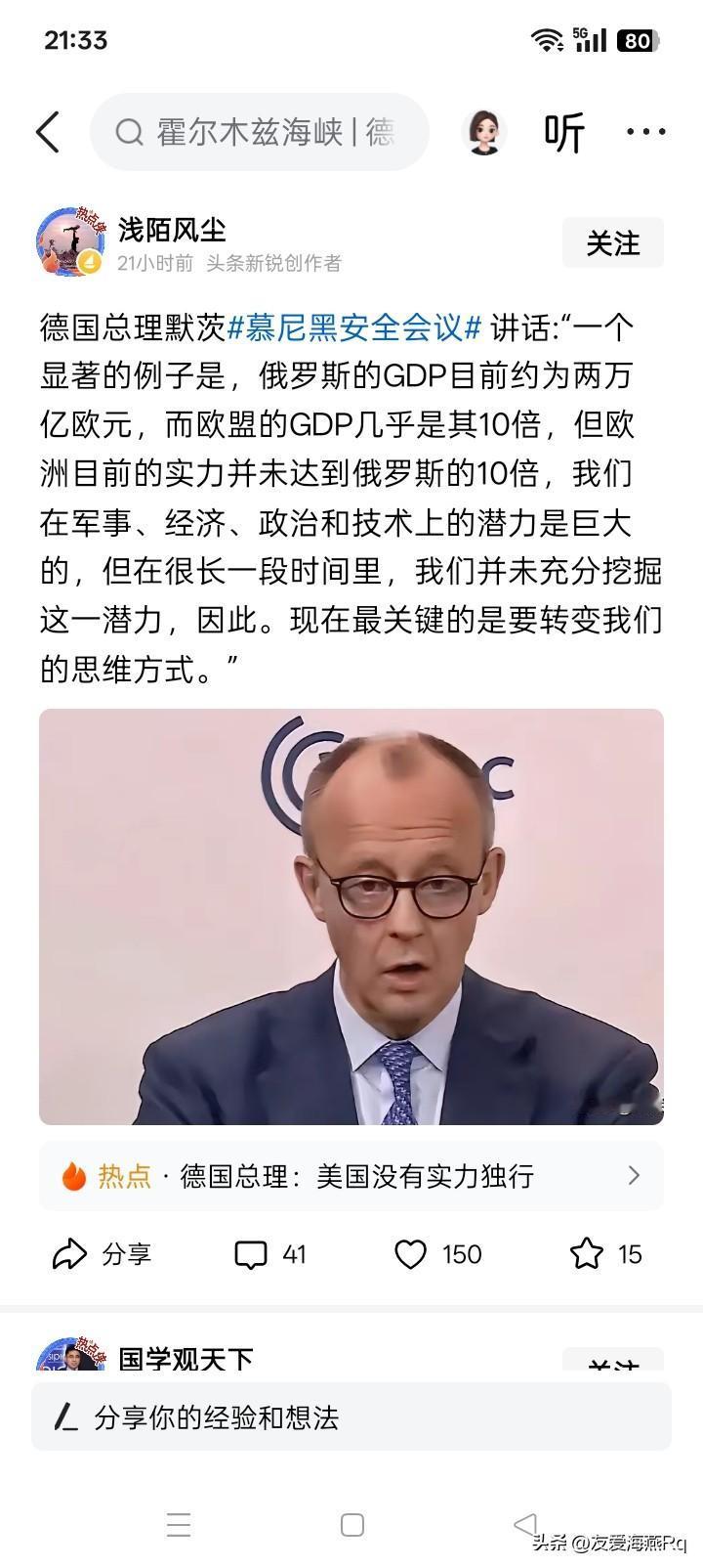 确实不可思议! 有消息说,欧洲的经济体量好像是俄罗斯的十倍,并且在先进工业和科学技术方面,估计更是远远超过俄罗斯。 然而,一旦战争爆发,或者受到军事威胁,欧洲好像就立马对俄罗斯畏之如虎,忌之如狼。特别是现在的乌克兰战争之中,如果没有或不购买美国的武器装备,连援助乌克兰的武器都捉襟见肘,束手无策,甚至可能是根本就没有。 欧洲在美国的羽翼下享受的太平时间太久了,早已经养成了事事都要靠美国的军事力量才能继续生活下去。但现在,美国总统特朗普好像深感美国为了欧洲的安全,付出的太多,吃亏太大,要与欧洲算算账,甚至是考虑退出他们的军事联盟北约。 目前的欧洲,似乎应该彻底的考虑自己未来的安全,明白美国靠不住这个逻辑思维。实际上,别人或别的囯家,如果没有利益可图,一般都是靠不住的。