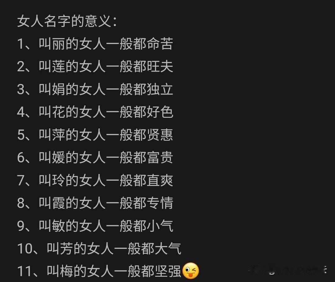 图1有几方面说得不错,叫“霞”的女人专情,图2的林青霞就是证明;叫“莲”的女人旺夫,潘金莲实在太旺夫了,武大扛不住;叫“媛”的女人富贵,我前女友就是,嫁入豪门,享不尽的荣华富贵。希望朋友们举个栗子以证实或证伪。真理不辨不明,不允许质疑的只有邪教!