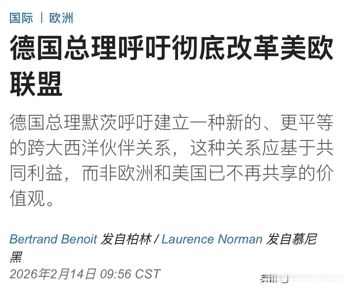 华尔街日报在德国慕尼黑报道:德国总理默茨(Friedrich Merz)认为MAGA并不在欧洲适用。呼吁建立一种新的、更平等的跨大西洋伙伴关系,这种关系应基于共同利益,而非欧洲和美国已不再共享的价值观。
