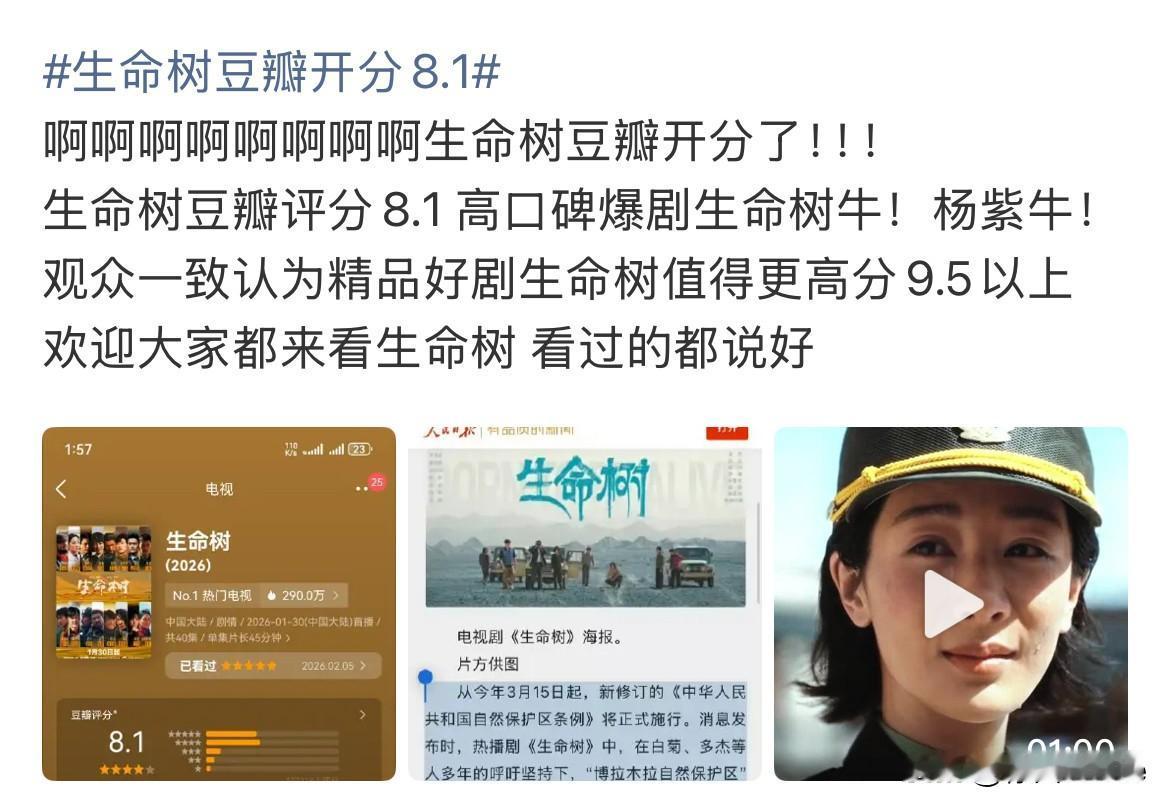 2月14日,杨紫《生命树》🫘开分8.1 分 看到分的那一刻,脑袋里在放烟花!杨紫再一次在开局一水一星中凭实力证明了自己! 这部剧虽然不受主流市场的喜欢,但受主流观众的喜欢,得有多少个五星,才能到前期铺天盖地的一星拉平,每每想到这点都格外开心,这件事凭借紫米是做不到的,必须要自来水的加入,虽然这部剧的自来水不多,但看到有很多自来水为这部剧添砖加瓦的时候,就能感受到这部剧的魅力,看进去了是真好看!今年杨紫领奖台上见!
