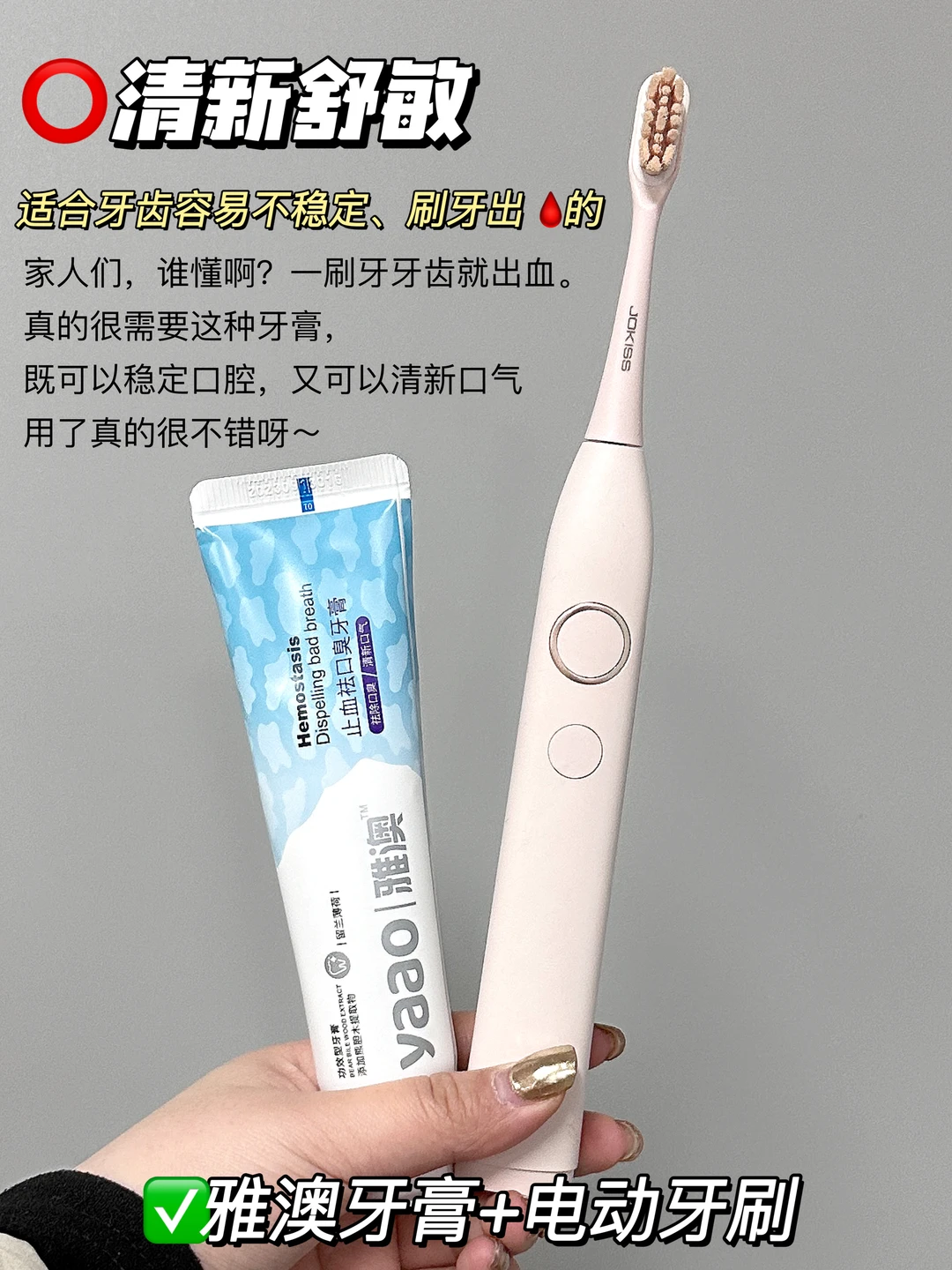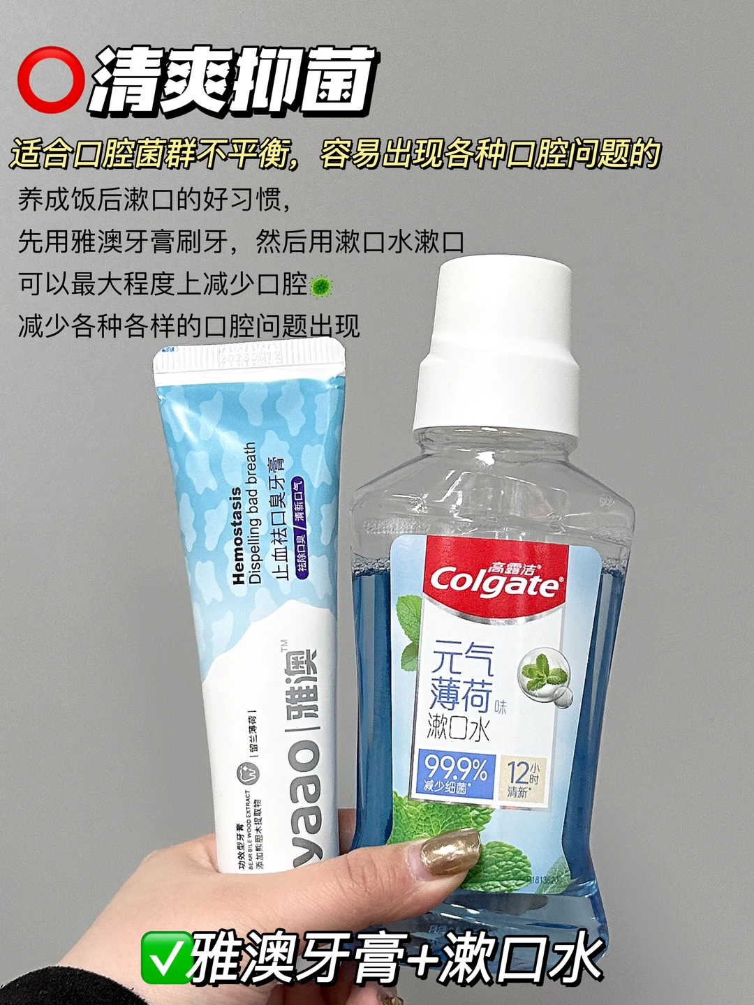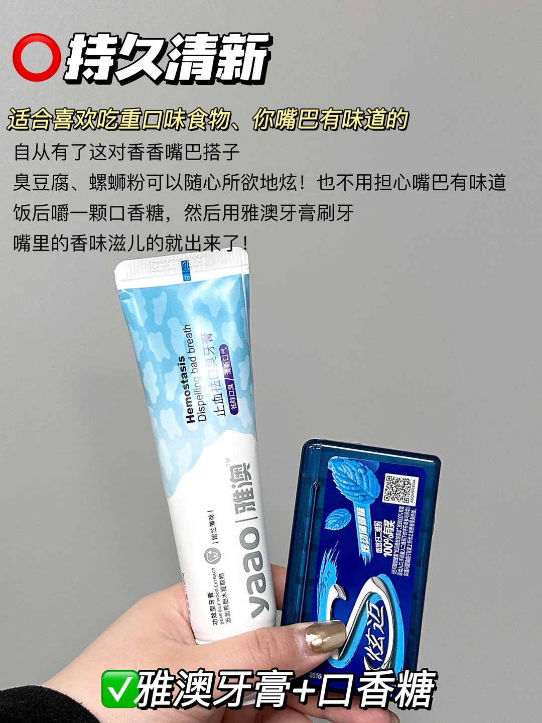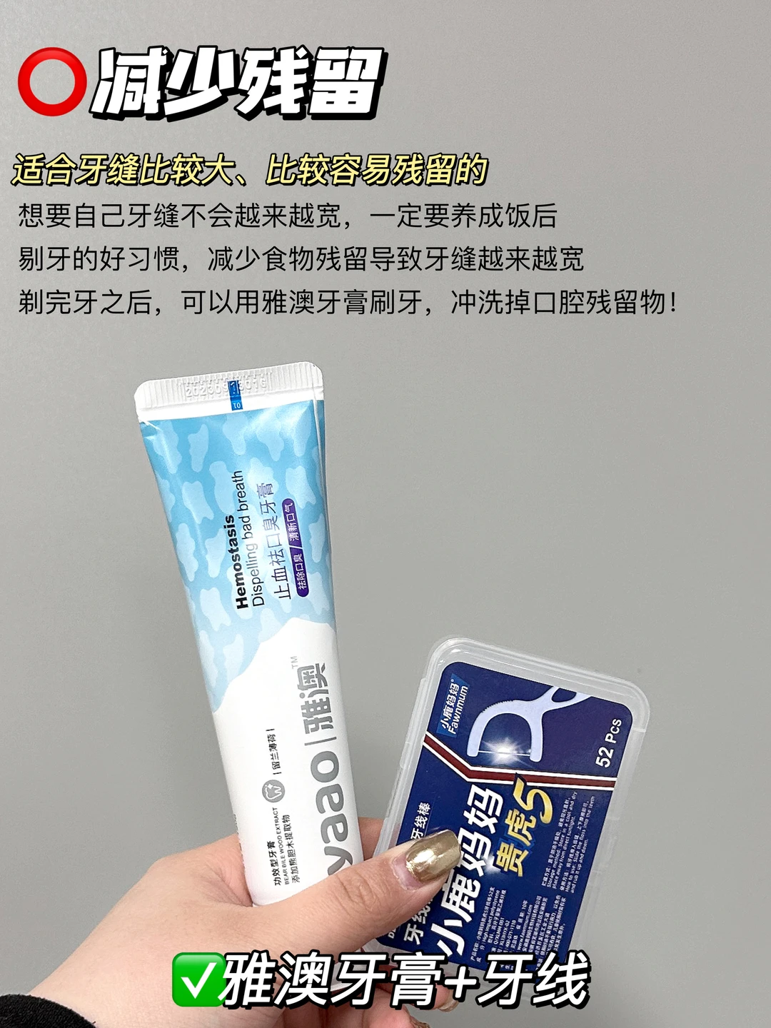 家人们谁懂?作为雅澳家的死忠粉 我几乎要把它家所有的产品都承包了 几乎每个品都用过,甚至回购不止一次 特别是雅澳牙膏,空瓶了还会囤的程度! 好家伙!一路用!用不停!从旧包装用到新包装! 一支搞定口臭,牙齿不稳定 而且它还巨巨巨百搭 和任何一款热门产品都是天仙配! 都能碰撞出不同的火花💥! 姐妹们,速学这4招 - 👉雅澳牙膏+电动牙刷——清新舒敏 👉雅澳牙膏+牙线——减少残留 👉雅澳牙膏+口香糖——持久留香 👉雅澳牙膏+漱口水——清爽抑菌