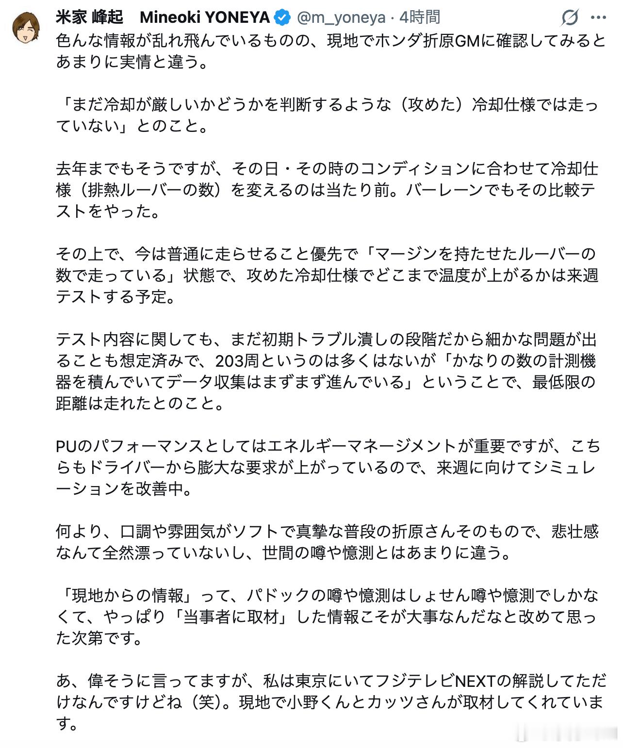 今天,日本F1媒体F1LIFE主编米家峰起写了一篇推文,对近日阿斯顿·马丁赛车传出的本田动力单元问题进行了说明。在巴林现场采访了,本田F1赛道负责人兼总工程师折原伸太郎,解释了本田F1动力单元到底如何。