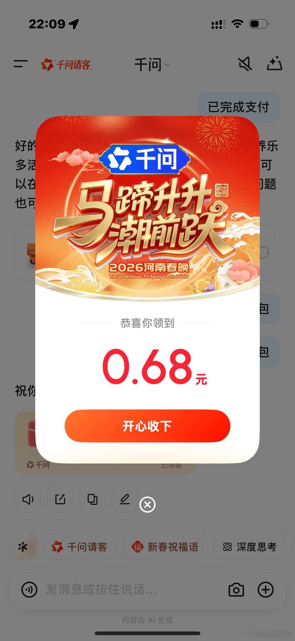 千问口令,河南春晚红包我领到了0.68,还有更多的朋友吗最近红包好多呀