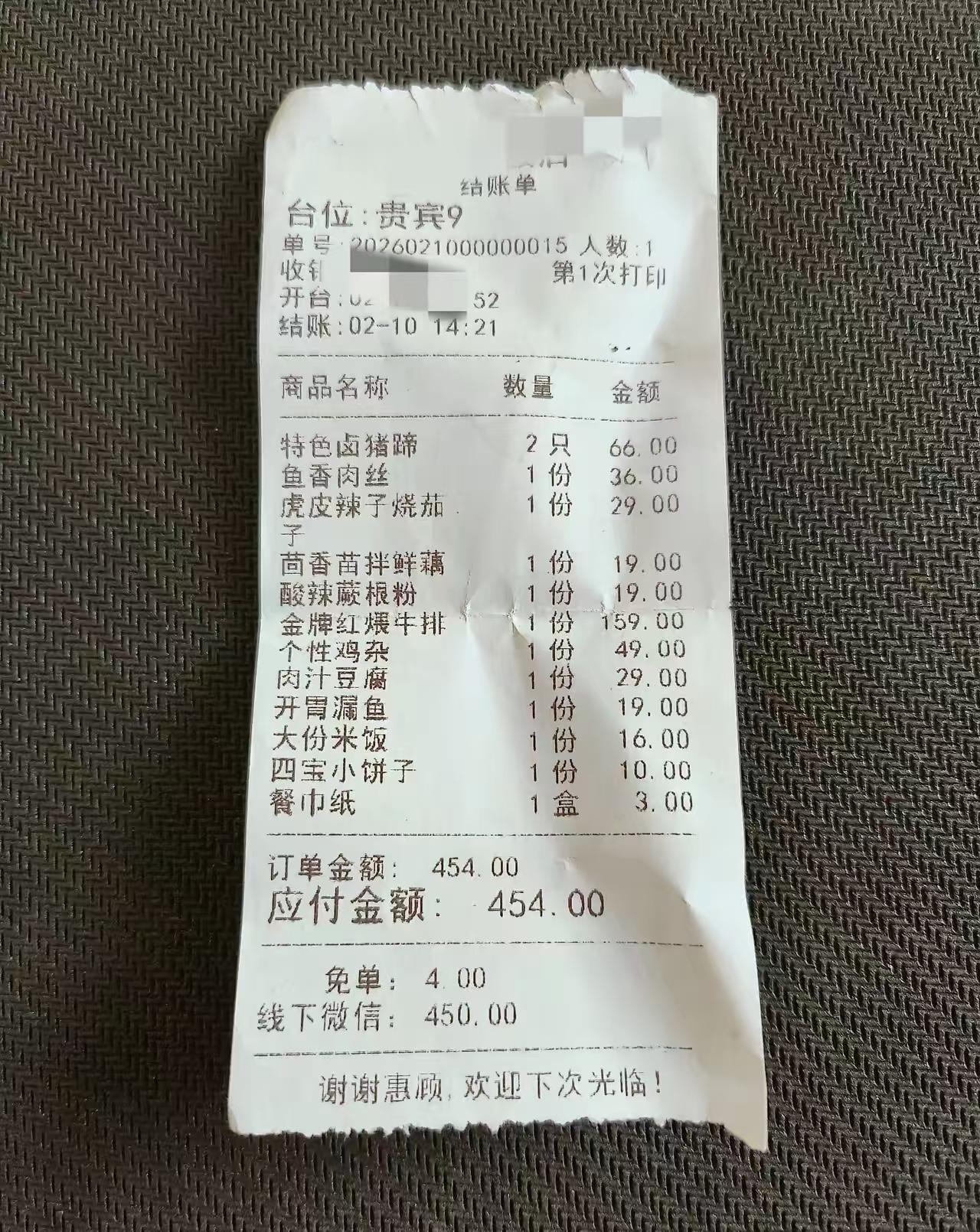 一顿饭花了450元。家里来客人了,上饭店招待一顿饭花450元算多吗?菜单上只有牛排贵点,其他都是家常菜正常价,没几个硬菜,有点小气了。 9个菜供13人吃,人均消费较高,光米饭就要收16元还是有点凶,荤菜不多价格不亲民素菜也不便宜。 一顿饭450元,对于普通家庭消费不低,不是一般家庭消费得起的,对于有钱人来说,450元又太寒酸了,中国的贫富差距太大了。 我上次去外面吃饭,十个人,十二份菜,预订一千块钱,有烧猪、斑鱼、排骨、八个大菜,份量很足,还剩一半吃不完,打包。 坐标郑州,两个外甥来了去饭店吃的川菜,要了四荤两素六个菜,花了三百五十二,吃的也不错! 这是北方一般饭店的价格,如果是星级酒店,价格比这高一倍,如果是在西湖边的餐馆,价格比这高70%左右。