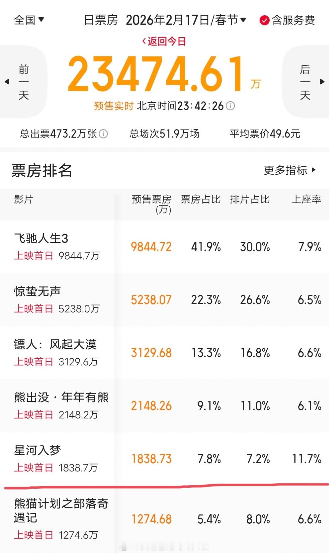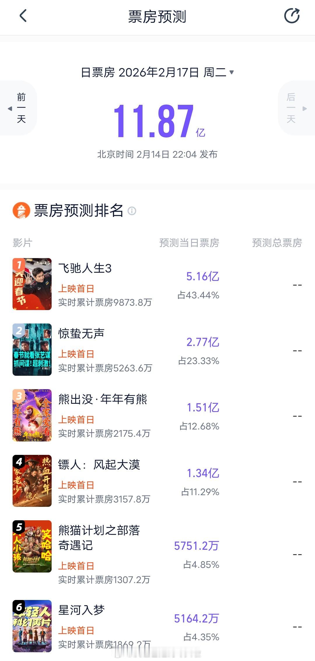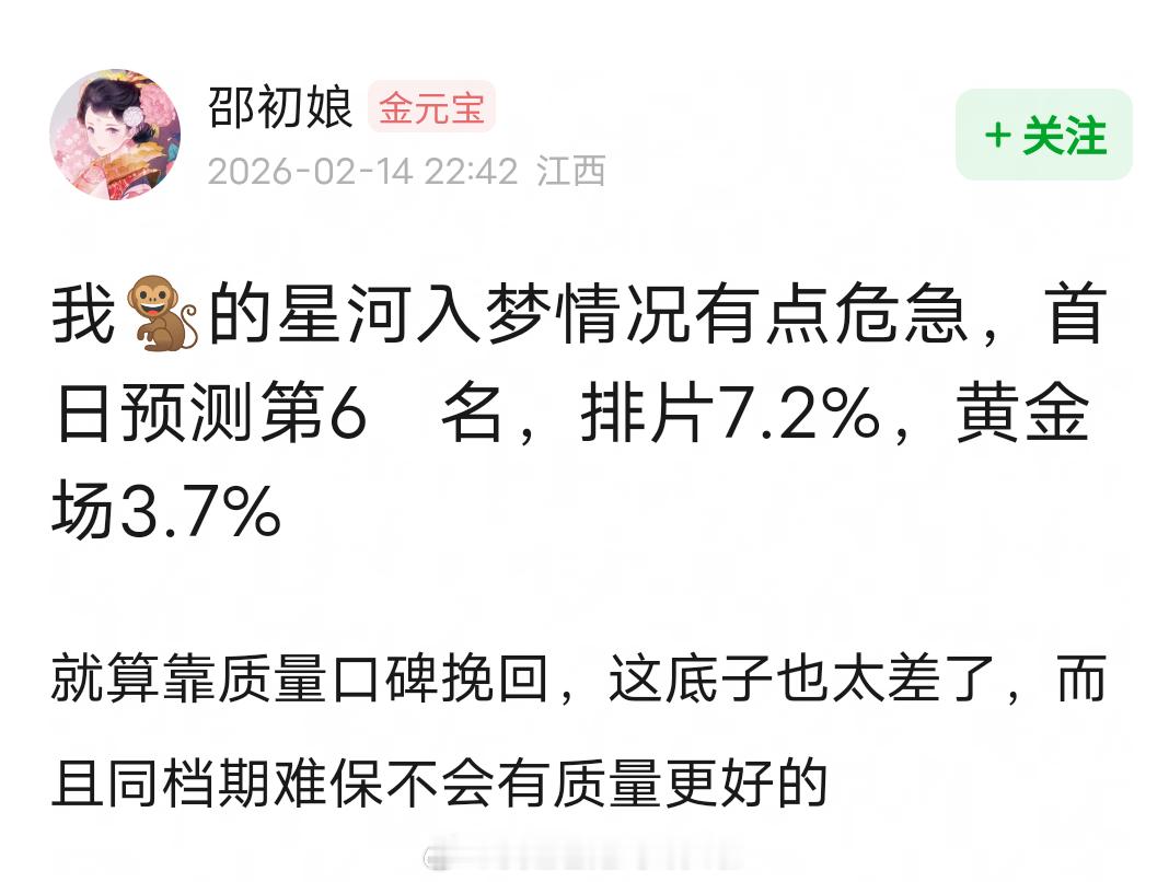 王鹤棣宋茜《星河入梦》目前首日排片7.2%,春节档垫底。黄金场次占比更是只有可怜的3.7%,简直是地狱开局。灯塔预测首日票房5164万,猫眼6032万,能靠质量和口碑逆袭吗???