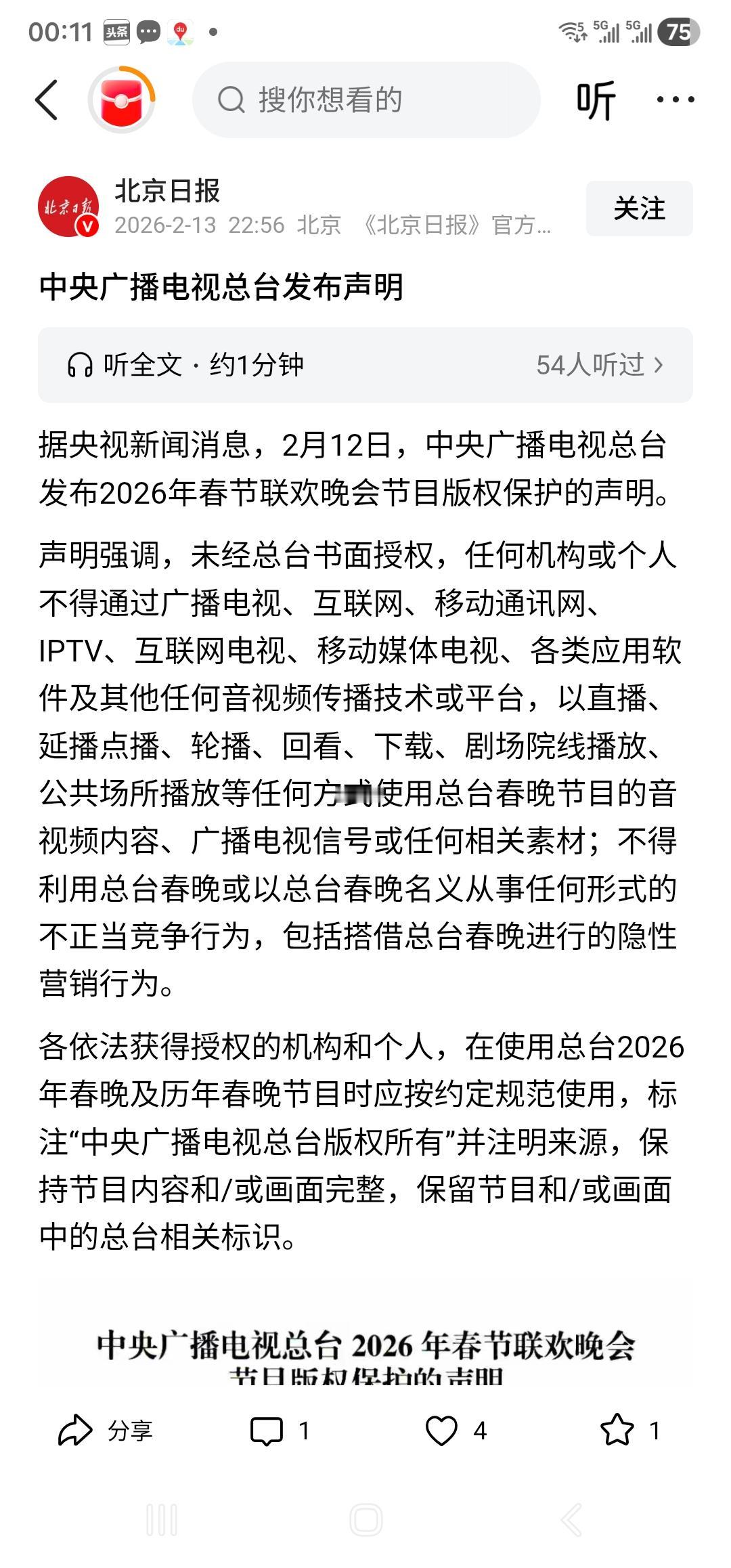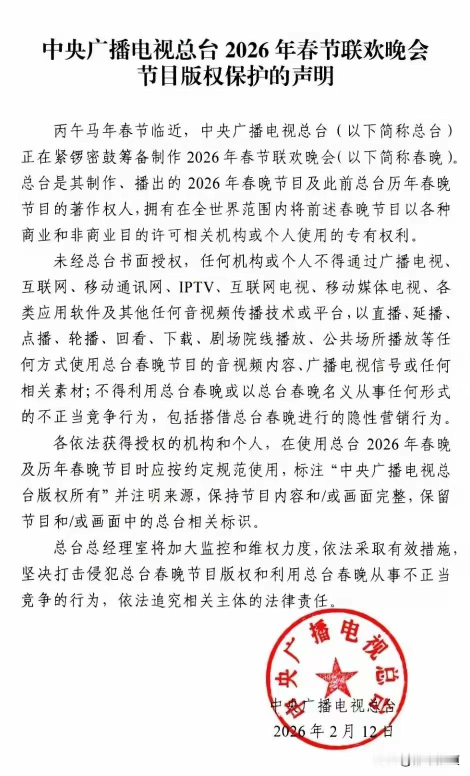 看到中央广播电视总台发布的版权保护声明,第一感觉是假的,没想到查了下,是真的! 声明强调,未经总台书面授权,任何机构或个人不得通过广播电视、互联网、移动通讯网、IPTV、互联网电视、移动媒体电视、各类应用软件及其他任何音视频传播技术或平台,以直播、延播点播、轮播、回看、下载、剧场院线播放、公共场所播放等任何方式使用总台春晚节目的音视频内容、广播电视信号或任何相关素材;不得利用总台春晚或以总台春晚名义从事任何形式的不正当竞争行为,包括搭借总台春晚进行的隐性营销行为。 这个声明,不得不说 非常全面! 非常严谨!
