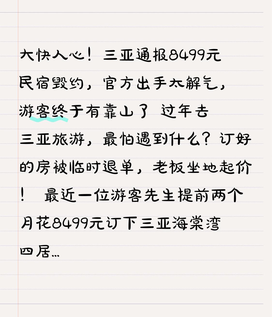 大快人心!三亚通报8499元民宿毁约,官方出手太解气,游客终于有靠山了 过年去三亚旅游,最怕遇到什么?订好的房被临时退单,老板坐地起价! 最近一位游客先生提前两个月花8499元订下三亚海棠湾四居室民宿,19晚春节档期,钱都付完了,结果出发前一天,房东直接甩来一句:住不了,你自己找地方吧! 李先生当场崩溃:机票已定、全家出行,再查同款房源,价格已经飙到三四万,翻了近4倍!明摆着就是看春节涨价,想毁约重租赚黑心钱。消息一出,全网炸锅:这不就是趁火打劫、破坏契约吗?多少游客春节出行,就栽在这种临时毁约上! 一开始大家还担心:人在外地、投诉无门,大概率只能吃哑巴亏。转折点来了!三亚官方火速通报,处理结果直接封神! 接到投诉后,“三亚放心游”平台第一时间启动先行赔付,全额赔付损失;涉事民宿被全平台下架、暂停线上经营,直接列入民宿行业黑名单,重点监管、绝不姑息。从曝光到办结,一天之内搞定,游客不用扯皮、不用等待,权益稳稳保住。 官方明确表态:春节旅游市场零容忍,订单确认即生效,严禁单方毁约、哄抬房价。用最硬的态度、最快的速度,护住每一位游客的出行底气。 这场风波告诉我们:旅游城市的口碑,从来不是靠涨价赚快钱,而是靠诚信留人心。一间房、一次守信,守住的是游客的信任,撑起的是一座城的脸面。契约有价,良心无价,想靠毁约发春节财,最终只会砸了自己的招牌。 为三亚果断处置点赞!也愿每一位出行的人,都能订得放心、住得安心、玩得开心。支持严惩坐地起价、守护消费公平的,点赞转发,让诚信走遍天下!