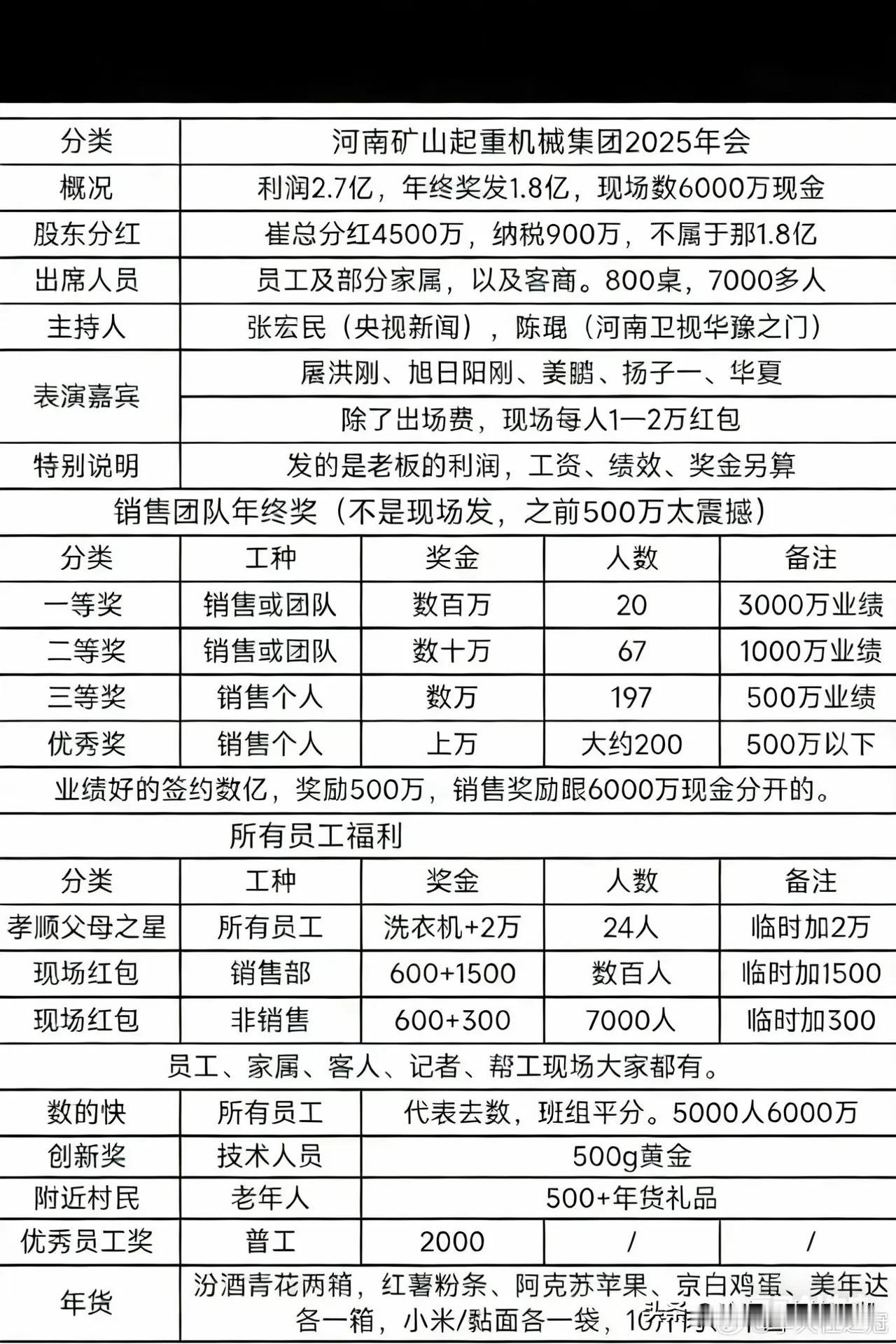 一觉醒来, 河南矿山崔老板火出圈了! 利润 2.7 个亿,年终奖发了 1.8 个亿,现场数现金 6000 万。 这格局,这胸怀,这气度,我估计这段时间没有其他哪个企业家老板敢蹭热度发声评论的,相形见绌、自惭形秽呀。 不要说老板了,估计现在连各大公司员工都不好意思晒自己的年终奖了,看着自己手里那三瓜俩枣,还是低调点吧。 不信的话请网友们晒晒你们的年终奖如何?