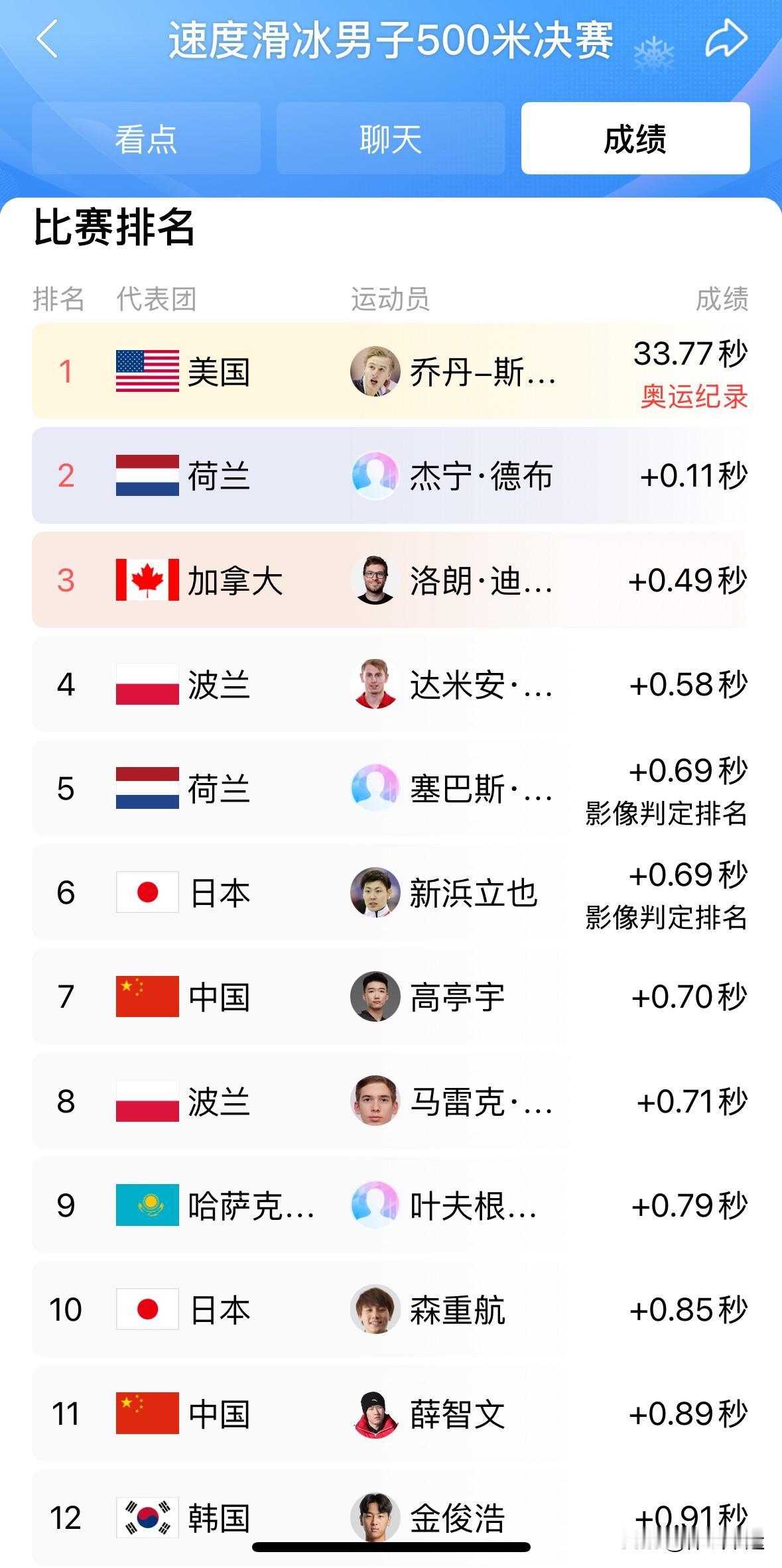 卫冕冠军中国名将高亭宇获得第七名[捂脸][比心][作揖][作揖][作揖] 米兰冬奥会速度滑冰男子500米比赛太让人意外了。卫冕冠军高亭宇以34秒47的成绩仅排第七,而前三名都打破了他上届创造的34秒32的奥运纪录。美国选手乔丹·斯托尔兹以33秒77夺冠,荷兰人詹宁·德布和加拿大人洛朗·杜布雷伊也表现出色。 咱中国队还有廉子文和薛智文参赛,廉子文34秒76排第14,薛智文34秒66排第11。如今“00后”新生代选手崛起,对老将冲击很大。虽然高亭宇这次卫冕失利,但体育竞技就是这样充满变数,期待他未来能再展雄风。 米兰看冬奥会 米兰冬奥速滑