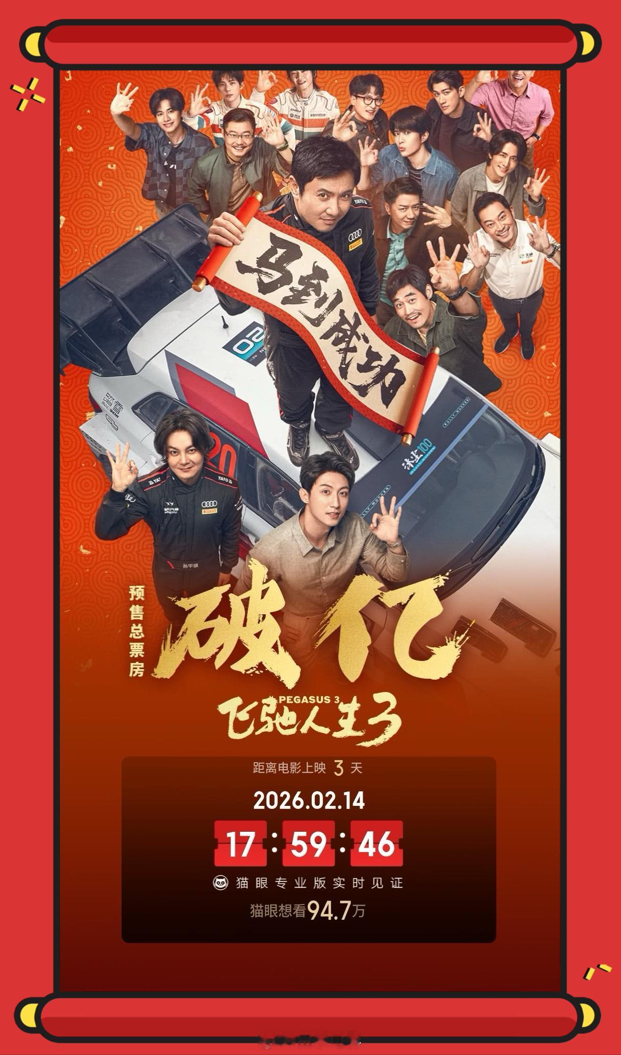飞驰人生3预售票房破亿恭喜🥂《飞驰人生3》距上映前3天,预售票房破1亿大关,成为2026春节档预售首部破亿影片。沈腾、范丞丞大年初一我去影院看你俩。😁飞驰人生3暂列春节档预售第1田宇院线播报