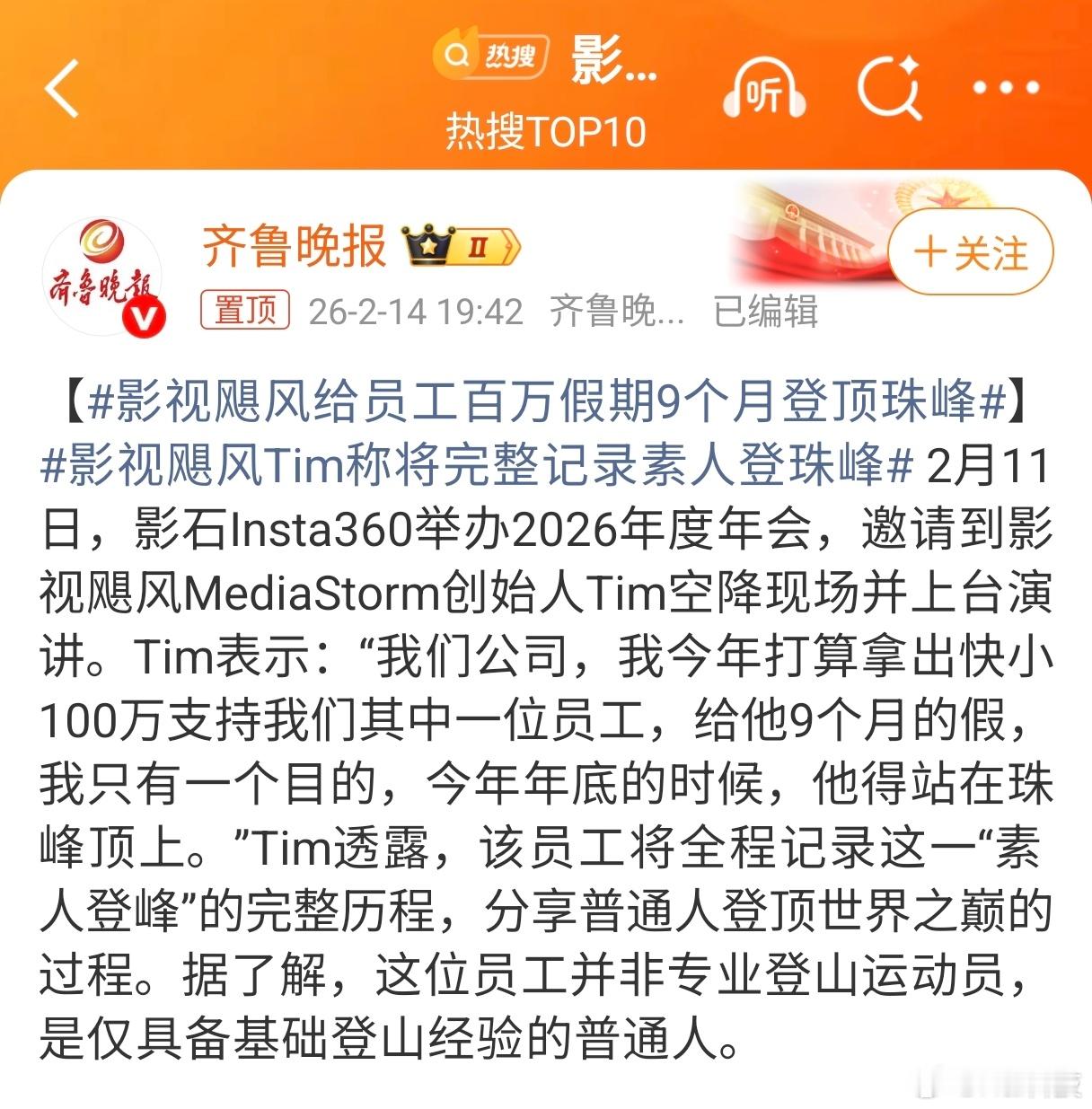 这样的老板真心好,出手阔绰,帮助员工实现梦想单纯佩服和感动影视飓风Tim称将完整记录素人登珠峰