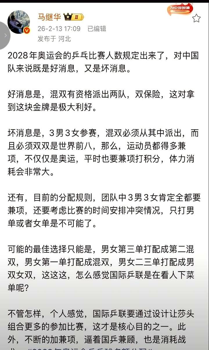 奥运混双金牌,国际乒联几乎是直接塞到国乒手里了。 2028年洛杉矶奥运新规,一个国家能上两对混双! 只要世界排名前八,孙颖莎/王楚钦,加上林诗栋/蒯曼,这金牌等于直接上了两道锁。 但代价是,整个奥运队就3男3女,所有单打、双打、团体项目都从这6个人里出。 孙颖莎、王楚钦这种核心,一人至少得扛三项,体能直接榨干。 女队孙颖莎、王曼昱、蒯曼阵容深度还够用。 男队除了王楚钦和林诗栋,第三人选谁? 每一步都是在走钢丝。 这到底是给国乒上了双保险,还是给主力们上了三道枷锁?