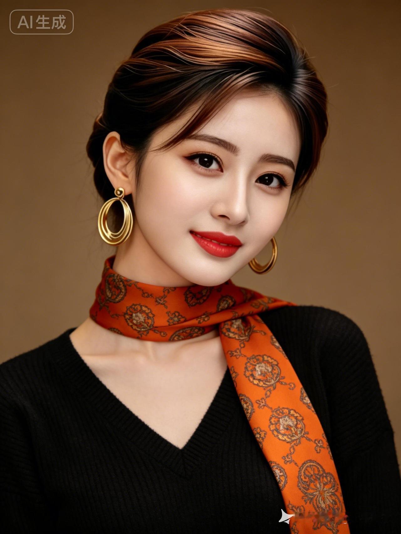 国风女子盘发精致,黑色V领毛衣搭配橙色图案围巾,咖色背景衬得气质温婉。回眸一笑甜媚动人,眼眸逼真有神,肌肤细腻高级,时尚摄影构图考究,电影滤镜氛围感拉满,尽显东方雅致。
