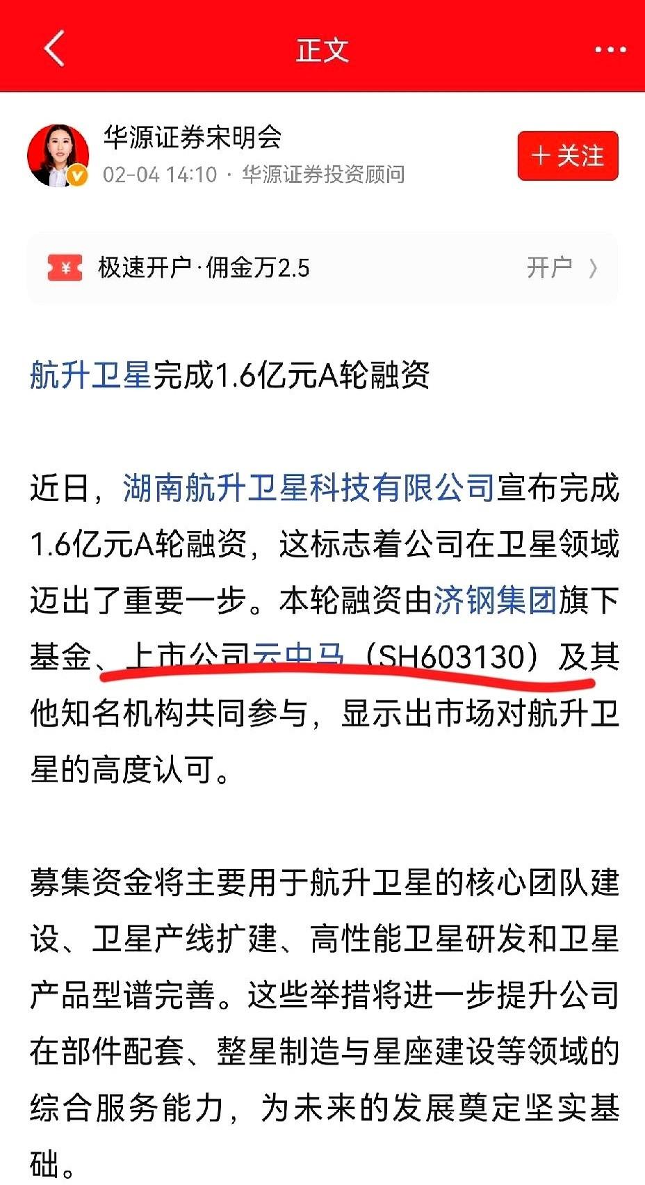 一看到“济钢”俩字要去搞卫星,我差点把咖啡喷出来。 第一反应是,这浓眉大眼的钢铁巨头也开始仰望星空了? 结果定睛一看,害,差点被绕进去。 跟你讲,此“济钢”非彼“济钢”。 出来搞事的这个叫“济钢集团”,不是咱老股民记忆里那个“济南钢铁”,跟现在的山东钢铁,一毛钱关系没有。 就玩了个文字游戏,借了个名头的光。你说这资本市场,到处都是套路。 那这事儿到底跟谁有关系? 背后真正关联的,是一家叫“云中马”的上市公司。 我顺手去瞅了眼它的K线图……怎么说呢,绿得发亮,简直是一路俯冲,不带拐弯的。 这下就有意思了。 一个跌得快找不着北的公司,突然就和“商业航天”这种顶流概念绑上了,还拉来一个听着像“国家队”的马甲站台。 这是要讲新故事了?还是准备放个大烟花? 说白了,现在但凡是个风口,就少不了这种真真假假的操作。 商业航天这赛道多火啊,国家都在往前猛推,肯定是未来。 这里面,有人是真刀真枪地干,想把火箭送上天。 但也有人,只想把“故事”送到咱散户的耳朵里。 所以啊,别听风就是雨。 看新闻得像剥洋葱,一层一层剥开看,看到最后,可能辣眼睛,但起码看清了芯儿是啥。