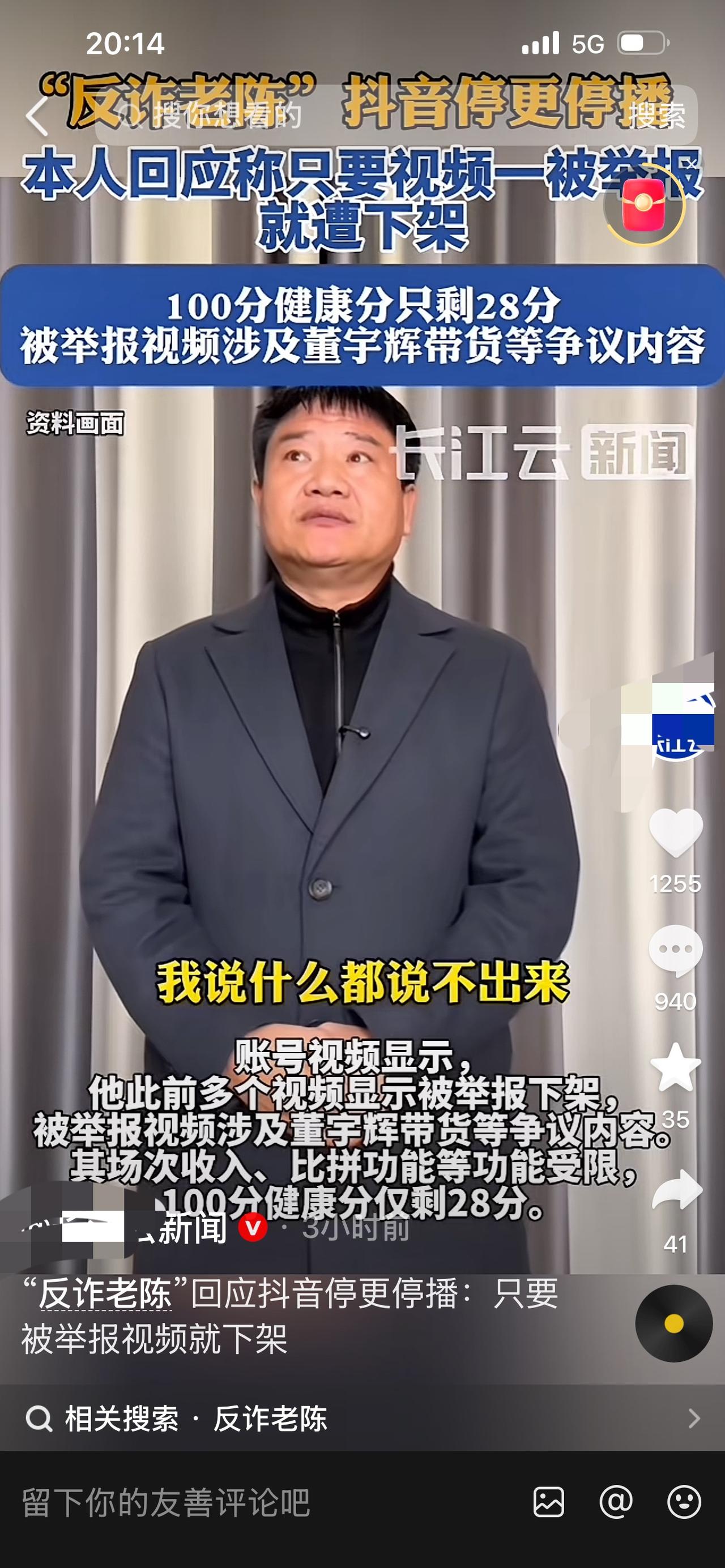 @反诈老陈 前脚发视频卖惨, 因为被举报, 被迫停播停更, 后脚的媒体就出来带节奏, 新闻通稿再一次神同步, 标题几乎雷同。 视频里的话术也是如此惊人的相似, 明里暗里为@反诈老陈 委屈, 认为老陈被捂嘴? 老陈被抖爸爸投诉真的是捂嘴? 还是他自己违规? 两个不同平台不同优惠价格来对比, 公平吗? 我不能也不敢说什么平台涉嫌恶性竞争, 毕竟每个平台的家底不一样, 价格机制也各有不同。 至于说什么虾仁是一家, 质量也一模一样。 我没买过, 也不能随意评判。 但是我想说的是, 同样重量同样规格的虾仁, 还同样品质, 价格相差50元, 你们觉得合理吗? 几斤大虾出一斤虾仁? 大虾什么价位? 真正懂行的人自己去算一下, 69元一单还不含保水剂的虾仁价格正常? 还是一百多的虾仁价格正常? 抖音平台便宜虾仁也有, 只想问你们自己会买吗? 一百多一单的虾仁不是只有与辉同行在卖, 为什么再一次针对与辉同行? 董宇辉也从来没说过自己家里是最低价, 能接受价格自己就买, 接受不了就去买更便宜的, 董宇辉没有诱骗谁下单, 这样的质疑有必要吗? @反诈老陈 拉踩抖音, 力捧某东, 平台投诉他, 难道不是他自作孽? 再说了他委屈别人举报他, 他无辜吗? 他直播间里各种不堪语言侮辱与辉同行的女性粉丝, 直播公屏上乌烟瘴气, 与辉同行的部分女性消费者对他的言行无法容忍, 自发的抵制这样的网络毒嘴, 他无辜吗? 成年人为自己的言行负责, 不是三岁小孩子, 既然你做了就要承担后果, 不要喊委屈。 某些媒体在这时候出来阴阳, 合适吗? 这是在力挺@反诈老陈 ? 还是再一次掀起一轮新的风雨? 大家心知肚明。 作为一个社会人, 我还是真心希望现在的一些媒体正能量一点, 多曝光一些真善美, 不要为了流量和利益站队。 散会! 董宇辉