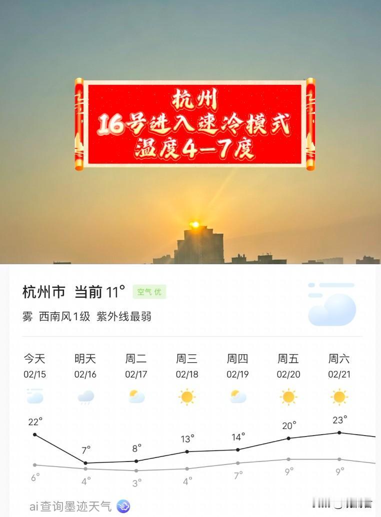 紧急提醒,2月16号杭州将进入速冷模式。 昨天晚上从北京回到了杭州,空气里已然有了湿漉漉的感觉,家里的空调从进门开始,就没有停止过。 晨露微曦,腊月二十八的杭州城,还在安静的沉睡,窗外传来叽叽喳喳清脆的鸟叫声,还有远处偶尔传来零星的声响,似炮仗。 杭州天气预报,2月15号最高气温22度最低气温6度,温差达到16度。说明杭州在夜里将会出现降温过程。果不其然,在2月16号.杭州将进入速冻模式,你若问我杭州有几度?那我告诉你,表示温度只用区区一只手,五根手指头就能轻松解决,问题是,早晚温差可以忽略不计。 来杭州旅游探亲的朋友们,春节期间来杭州千万别忘记带羽绒服。