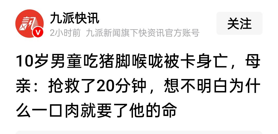 一块猪脚卡住喉咙,让10岁的孩子离开人世。 快过年了,看到这样的新闻,心里有点