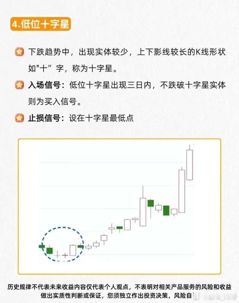 低位十字星:下跌中出现十字星,三日内不破实体,止损在十字星最低点……