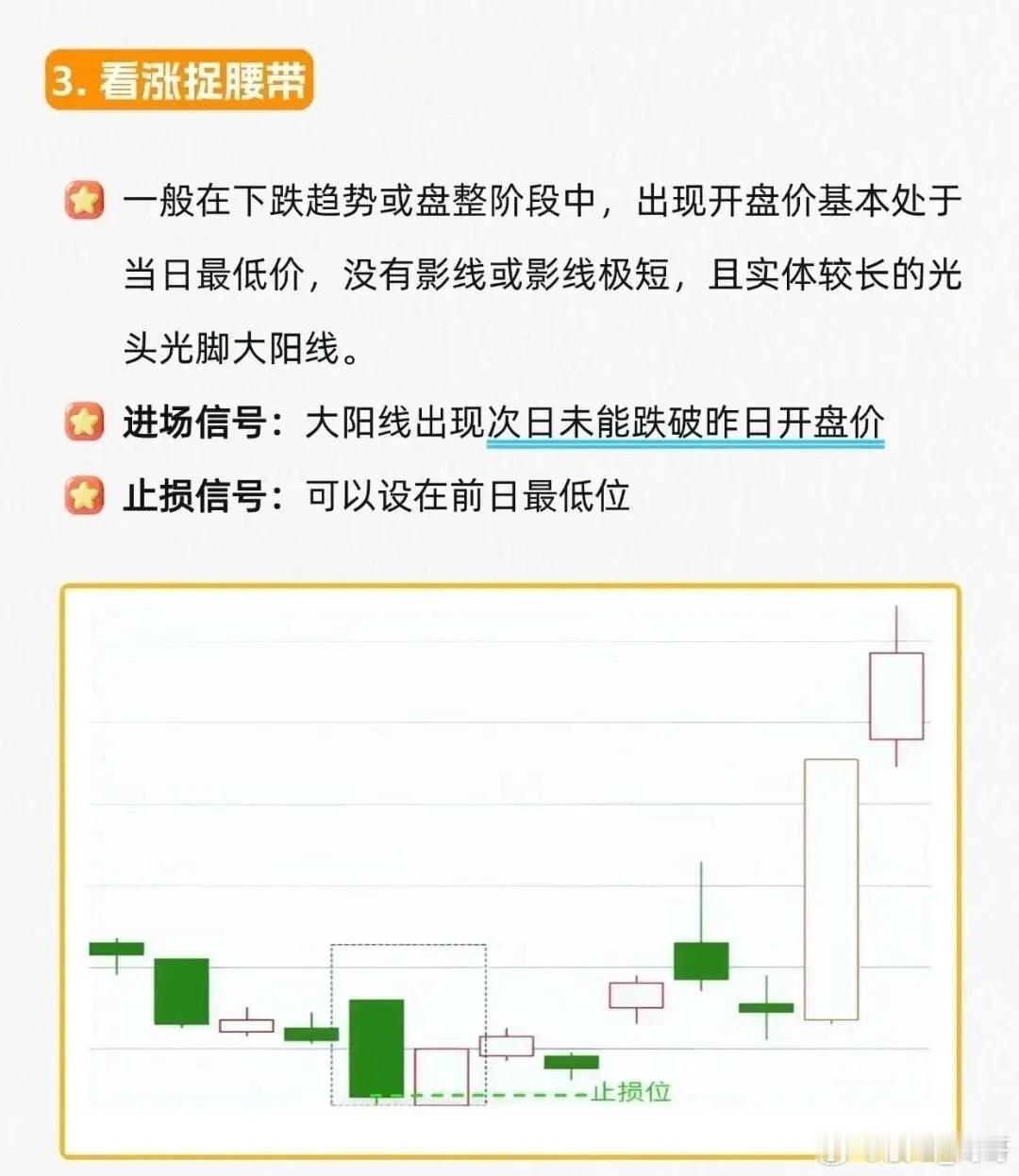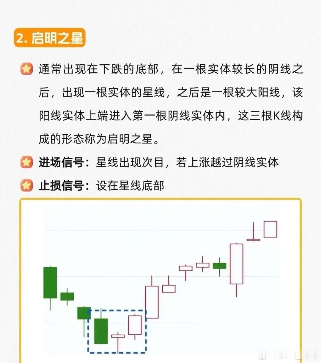 启明之星:底部长阴+星线+大阳,星线次日涨过阴线实体,止损在星线底部。