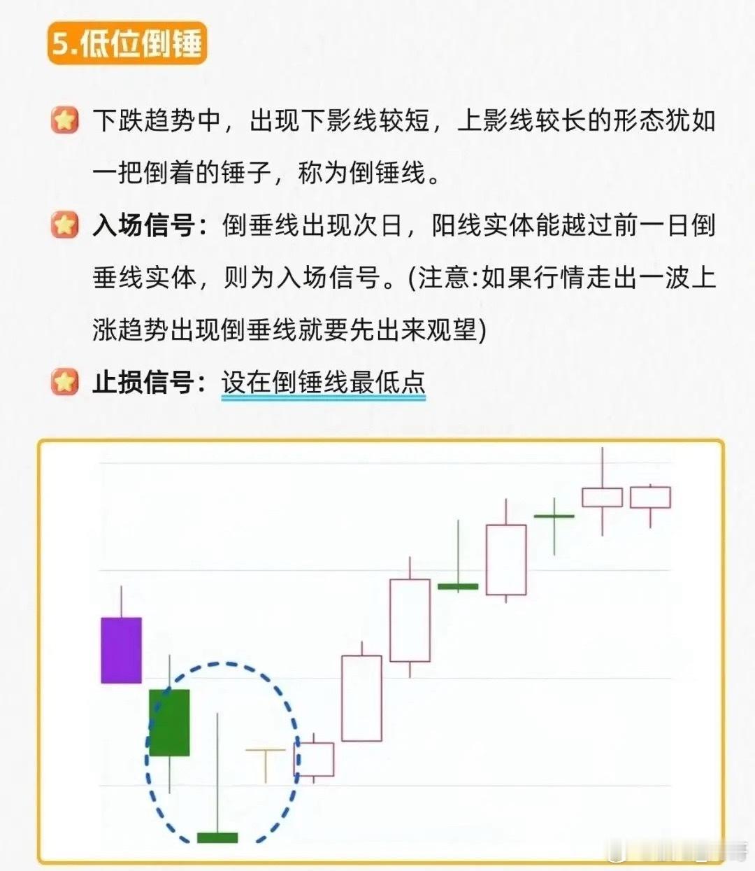 低位倒锤:下跌趋势中,下影线短、上影线长的倒锤线,是主力试盘信号。