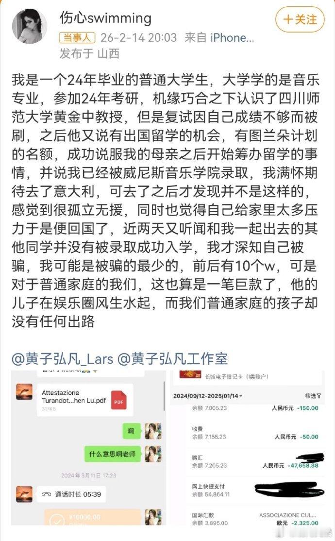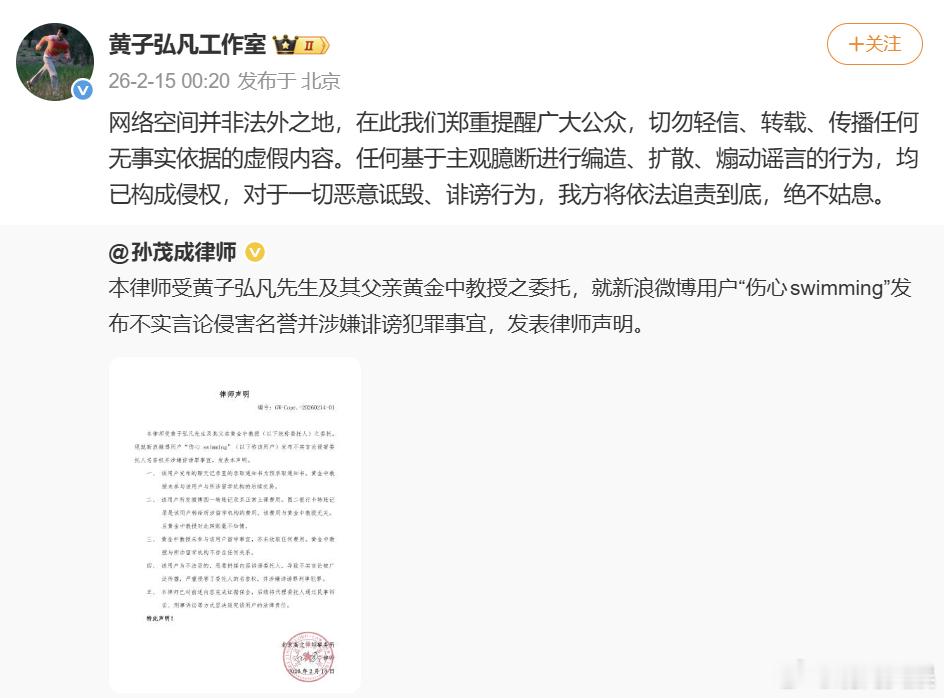 黄子弘凡方律师声明 14日,博主曝黄子弘凡爸爸诈骗学生,15日凌晨转发律师声明,否认黄子弘凡爸爸黄金中教授诈骗学生,称“伤心swimming”爆料聊天记录里中的录取通知书为预录取通知书,转账记录系正常上课费用,卡转账记录是该用户转给所涉留学机构的费用,该费用与黄子弘凡爸爸无关且其对此毫不知情。黄子弘凡爸爸未参与该用户留学事宜,亦未收取任何费用,与所涉留学机构不存在任何关系。并称“伤心swimming”不实言论已严重侵权,黄子弘凡方已完成证据保全,将对其进行起诉。