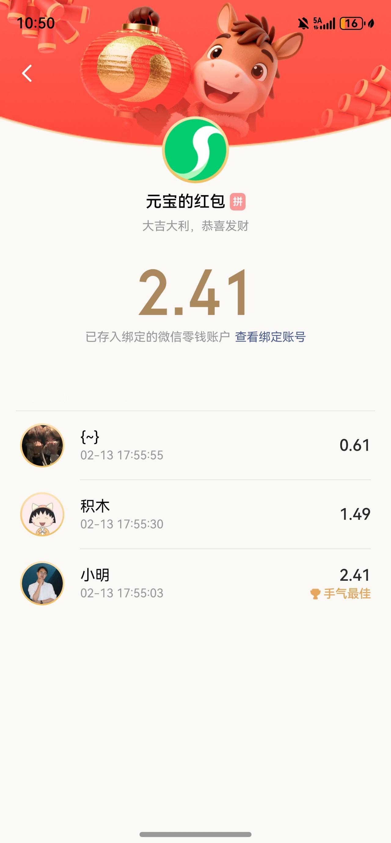 好家伙,新建了一个元宝派,聊了一会儿,元宝居然就在里面发红包了!我这运气如何?