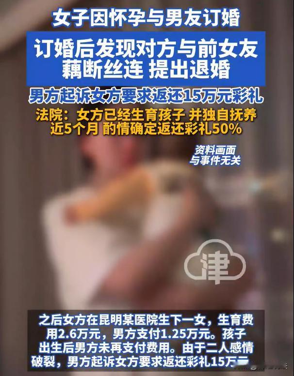 云南,一女子跟男友同居之后,发现自己意外怀孕了,男友则保证会跟她订婚、会对她负责。本来已经订婚,男方也给了15万元彩礼钱,谁知道女子看到男友还在跟前女友藕断丝连,两个人还偷偷的聊暧昧信息。这下,女子气的想要退婚,自此之后两个人一直闹不和。后来女子去医院将孩子生下来,独自抚养了5个月,男子继续上诉要求女子退还15万元的彩礼钱。 头条媒体津云报道了这则新闻,男子上诉之后,相关部门也给出了判定。 张女士在跟男友李某认识之后,两个人很快就感情升温,感觉适合,就确定了做男女朋友。 一开始二人经常出来约会,逛逛街之类,男友李某认为,总是约出来也不大方便,就跟张女士提出来,想要同居。 张女士思考了之后,也就答应了下来,这下,这对甜蜜的情侣,也就住到了一起。 同居了4个月之后,有一天张女士感到身体不大舒服,去医院一检查,竟然怀孕了。 把怀孕的事情告诉给男友之后,没想到男友态度还可以,满口承诺:“孩子生下来吧,我一定会对你负责任的。” 之后李某就带着女友张女士回家见了父母,没多久双方父母也被安排见了面。双方亲人都还算客客气气,都想要尽快促成这门婚事。 李某的父母提出,可以先给两个孩子安排订婚,同时,男方也给出了15万元的彩礼钱。 定亲仪式操办完毕,小两口也就正式开始了幸福的生活,二人也都沉浸的享受在“好孕”中。 可是有一天,就发生了不愉快的事情。 当时张女士看到男友正在埋头玩手机,表情很快乐,完全就沉浸在跟对方的聊天气氛里。 张女士凑近一看,男友的对话框里,显示的竟然是前女友的头像。 这下张女士可生气了:男友竟然跟前女友还藕断丝连,两个人的关系还如此暧昧,是不是男友还喜欢对方? 想到这,张女士直接摊牌,两个人就开始闹不和。 因为这事情,张女士经常夜不能寐,夜晚就会惊醒,想到男友背叛自己的画面。之后去医院治疗,竟然诊断为抑郁症。 思来想去,张女士并不打算放过男友,竟然“谎报军情”,去报案称,自己怀孕是因为被男友给侵犯了。 然而没多久后,张女士又后悔了,又跑过去主动撤销了案子。 总之,两个人就这样闹来闹去,感情早就破裂殆尽。 过了一个月后,张女士独自去医院生下了小孩,生育费用2.6万元。生下孩子之后,张女士要求男友也承担医疗费,李某支付了1.25万元。 在孩子出生之后,李某就再也没有支付任何费用,因为双方已经完全没有感情了,李某上诉了,要求张女士返还15万元的彩礼钱。 李某表示,也不清楚孩子是不是自己的,就先去做了鉴定,确定女儿就是自己的亲生骨肉。李某又声称,自己并没有犯错,也就是跟前女友正常聊天,不存在暧昧关系。 但是,万事都有个度吧,你女友都怀孕了,你还跟前女友联系做什么呢? 那么,彩礼案子是怎么判定的呢? 在经过一番审核,相关部门认为,张女士已经生育小孩,并且独自抚养,酌情要求张女士返还50%的彩礼钱给到李某。 本案释法: 如本案发生,女子未婚给男友生下小孩,之后孩子如果跟着女子生活,男方是否需要按时支付抚养费呢? 根据《民典法》第1071条规定,非婚生子女享有跟婚生子女同等的权利,任何组织或者个人不得歧视。 法律也有所规定,不直接参与抚养子女的一方,有义务去承担未成年子女或者不能独立生活的成年子女的抚养费。 由上述法律可知,孩子之后如果跟随张女士生活,李某作为孩子的父亲,不直接抚养孩子,必须依法支付抚养费,包括孩子的医疗费、教育费等必要开支。 不管父母是否结婚,孩子都有权获得父母双方的抚养保障,李某不可以推卸责任。 很多人表示,这种情况还退什么彩礼呢,稍微退个一万两万意思一下好了。不得不说,这种男子,真的很过分。 并且,这让张女士以后怎么嫁人呢?是男子有外心、违背了婚姻的契约,女子以后又要养娃、还要上班、感情还遭受挫伤,实在是吃亏。 对此,大家都怎么看待呢,不妨一起来讨论吧!