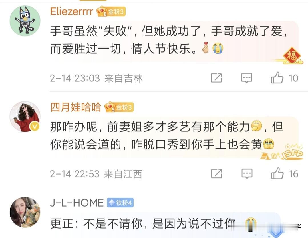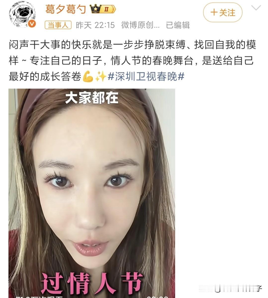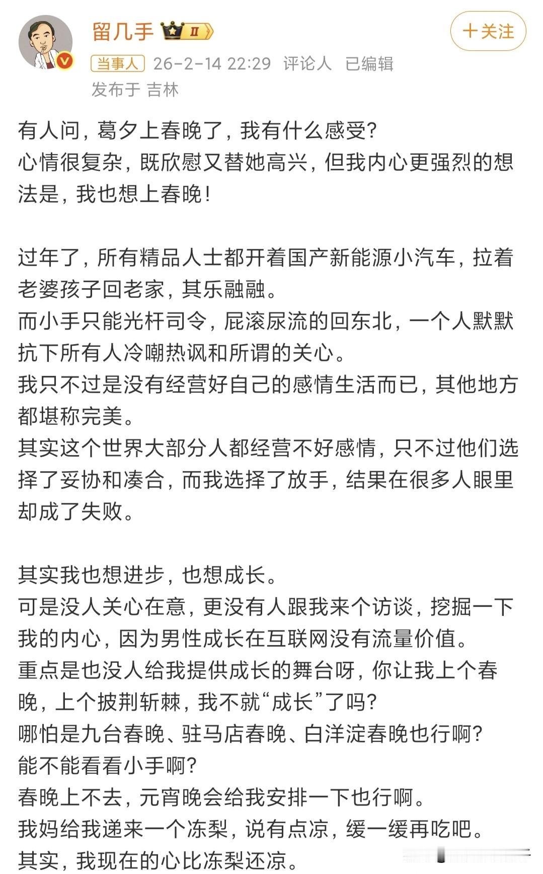 葛夕上春晚,留几手坐不住了! 2月14日,葛夕深夜发文,透露情人节,闷声做大事,登上深圳卫视春晚的舞台,看文案,大概的意思就是,让自己开心快乐,并晒出一段精彩表演的画面,该说不说,这个造型,这个装扮,还挺漂亮。 没过几分钟,留几手也在社交平台发文,谈及对葛夕上春晚的感受,坦言心情复杂,既欣慰又替前妻高兴,最后配了一张冻梨的照片,挺有深意。 不过,接下来的内容,就让人有些看不懂了,貌似有点自嘲的成分,总结:孤单寂寞冷,一个人默默扛下所有,心里拔凉。 还特意提了一句,当初结束这段感情,是自己选择了放手。 网友辣评:你的文案还爱她,字里行间里都是嫉妒,一股酸溜溜的味道,从来不放过蹭前妻热度的机会。 留几手发文开头特意强调为了回答网友的疑惑,然而,葛夕晒完视频,才几分钟,就坐不住了,也太快了,显然,这个解释有点苍白无力。 既然分开了,就应该一别两宽,各生欢喜,葛夕登上深圳春晚的舞台,留几手发自内心的高兴才对,这样才体面。