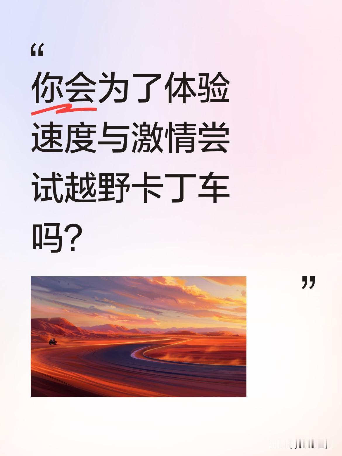 你会为了体验速度与激情尝试越野卡丁车吗? 最近不少越野爱好者晒出全地形车体验视频,视频里能听到"哎呦。速度遥遥领先"的感叹。这种集刺激与挑战于一体的运动,正在吸引越来越多追求新鲜感的人。有人说这是释放压力的好方式,也有人担心安全问题。你怎么看这种充满野性的户外体验?