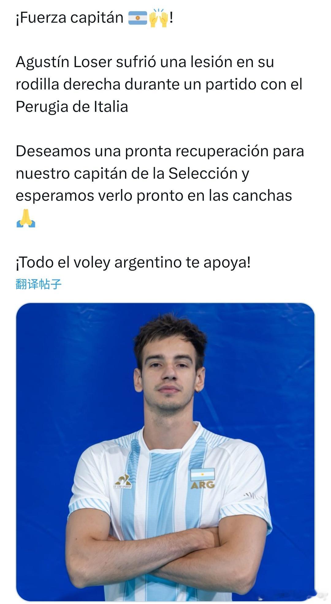 阿根廷排球联合会FEVA发文,祝福受伤的队长洛塞尔早日康复。