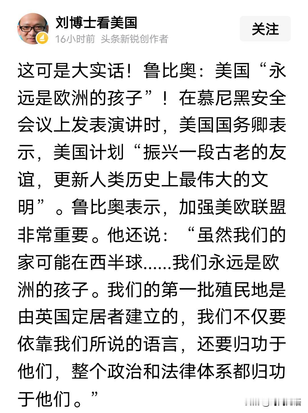 鲁比奥这话说的不准确,美国曾经是欧洲的孩子,确切的说是英国的孩子,但自从吕特对特朗普改了称呼欧洲就成了美国的孩子了。 鲁比奥本身就是古巴裔,现在的美国人大部分都是美、非、亚裔的孩子,只有极少部分人是欧洲的孩子。 只是鲁比奥在外交上的言辞确实比万斯强多了,这话欧洲政客们听了很受用,不管受到多大伤害都会继续跟随着美国。