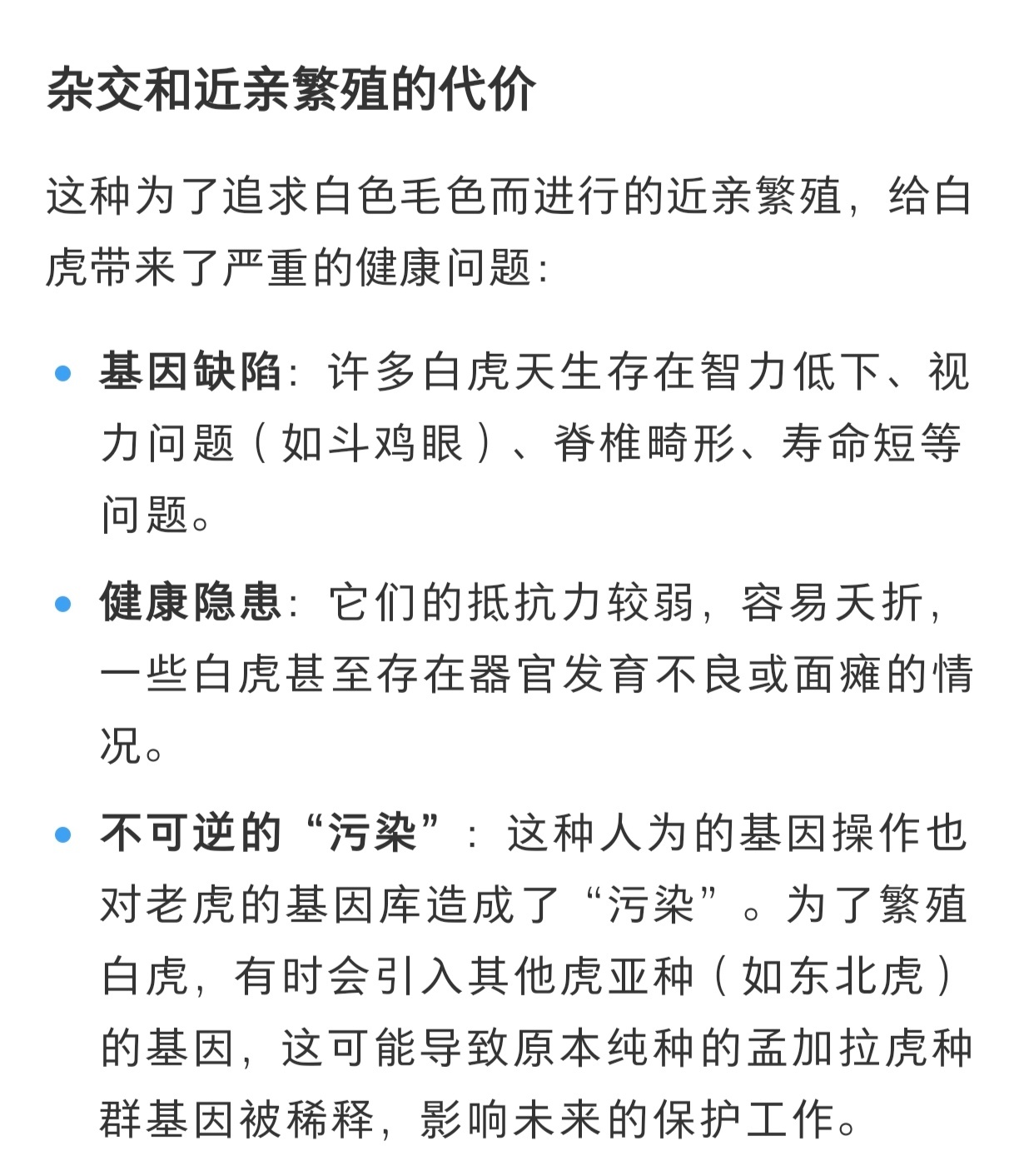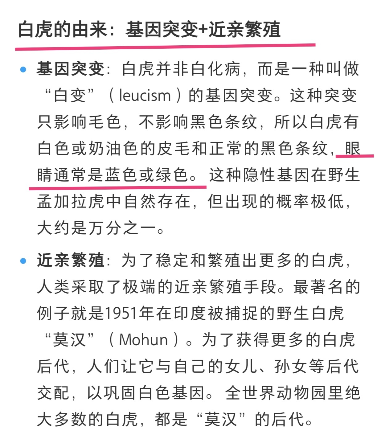 白虎、金虎都是老虎近亲杂交产物,他们描述为基因突变导致的“白化病”,而在自然世界,白化动物是极其极其稀有的存在,几乎都只有个例,看来他们就是在掩盖近亲繁殖导致白化概率大幅提高的真相。