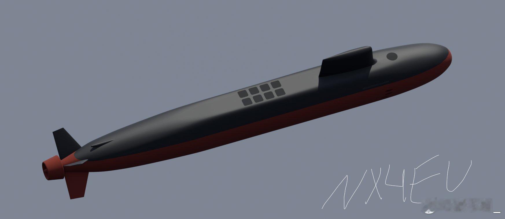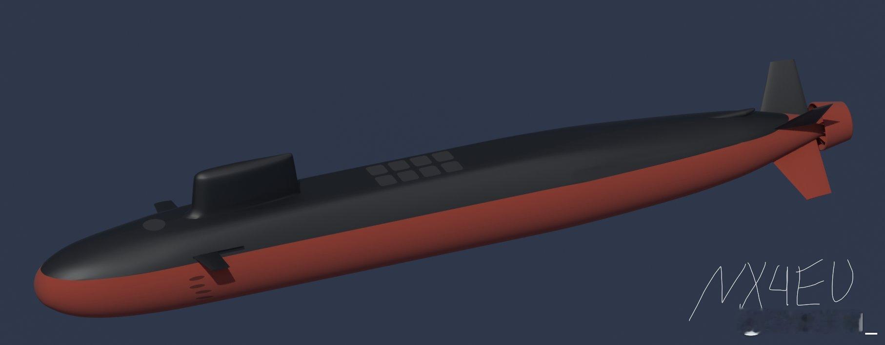 外网的095想象图,猜测其长 110 米,宽 12.5 米。围壳长 15 米,距舰艏 20 米。X 型尾翼,喷水推进,配备 8 个 3 联装垂直发射系统。排水量超过 1 万吨。
