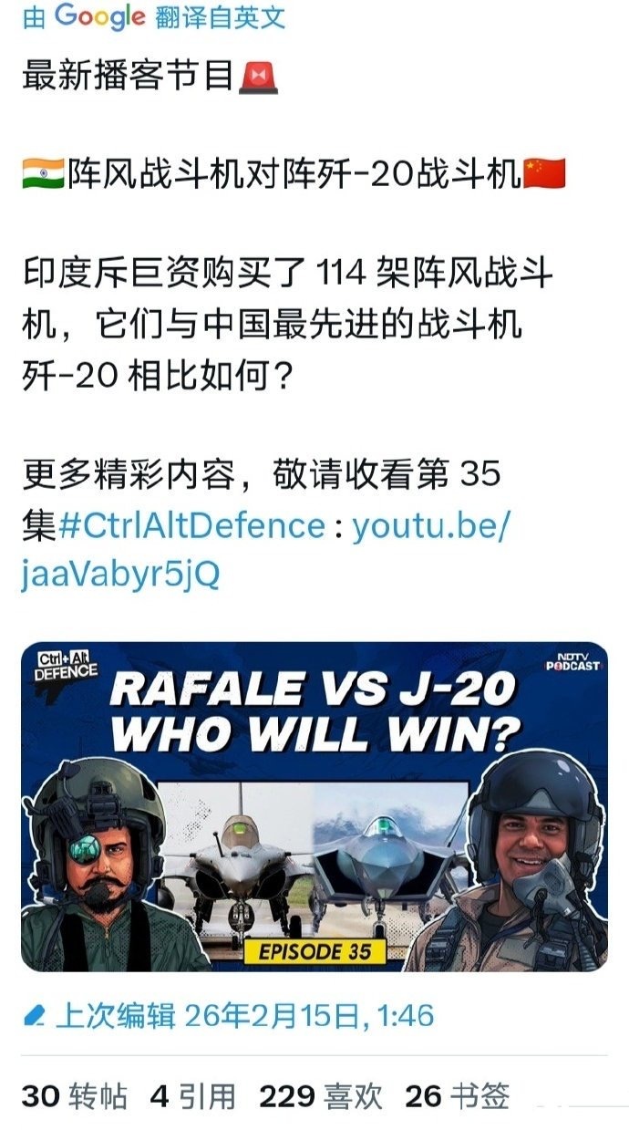 印度电视节目探讨歼20和阵风谁更强,结论是阵风更强。