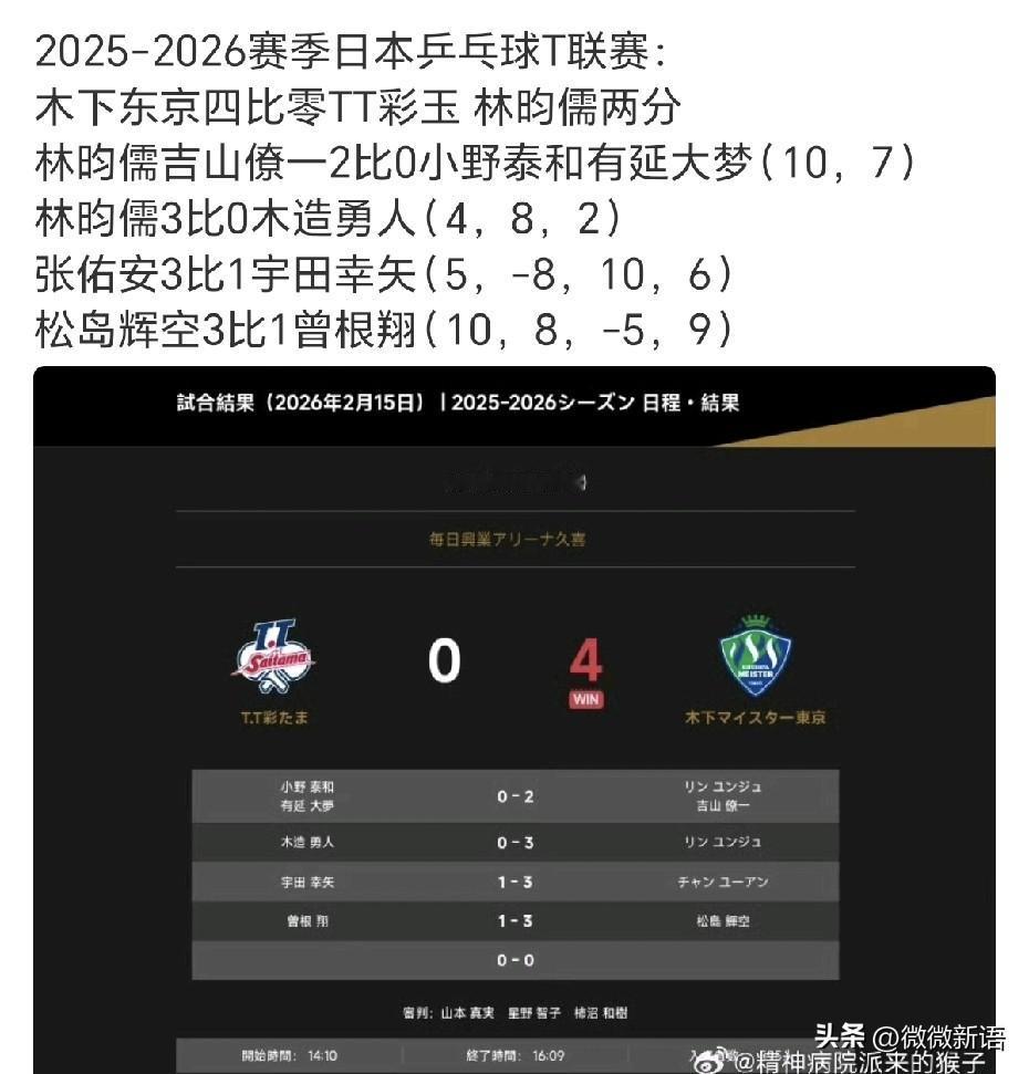 林昀儒、张佑安都去日本打T联赛了。 海口亚洲杯林昀儒没有去参加比赛,张佑安是打进了亚洲杯四强,拿到了直通澳门世界杯的参赛资格。海口亚洲杯期间,林昀儒有在积极备战新加坡大满贯赛,在大满贯赛前,林昀儒和教练一起去日本打比赛了,这次张佑安也去了,他和林昀儒都是木下东京俱乐部的。 在刚刚的比赛中,林昀儒是打了男双和男单,他一人为俱乐部拿到了2分,看到林昀儒的状态很好啊。上个月林昀儒是拿到了多哈冠军赛的男单冠军,在多哈球星挑战赛时,林昀儒因伤退赛,看来伤势好的也差不多了。不过林昀儒和自己的新球拍磨合的不错,打比赛的时候看着不一样了。 后面张佑安、松岛辉空各得了一分,这样木下东京俱乐部就是4-0赢了TT彩玉俱乐部。松岛辉空是打完全日锦的比赛后,就没有参加亚洲杯的比赛了,看来也是为新加坡大满贯赛做准备了,毕竟冠军可以拿到2000积分,大家肯定都会很拼的。