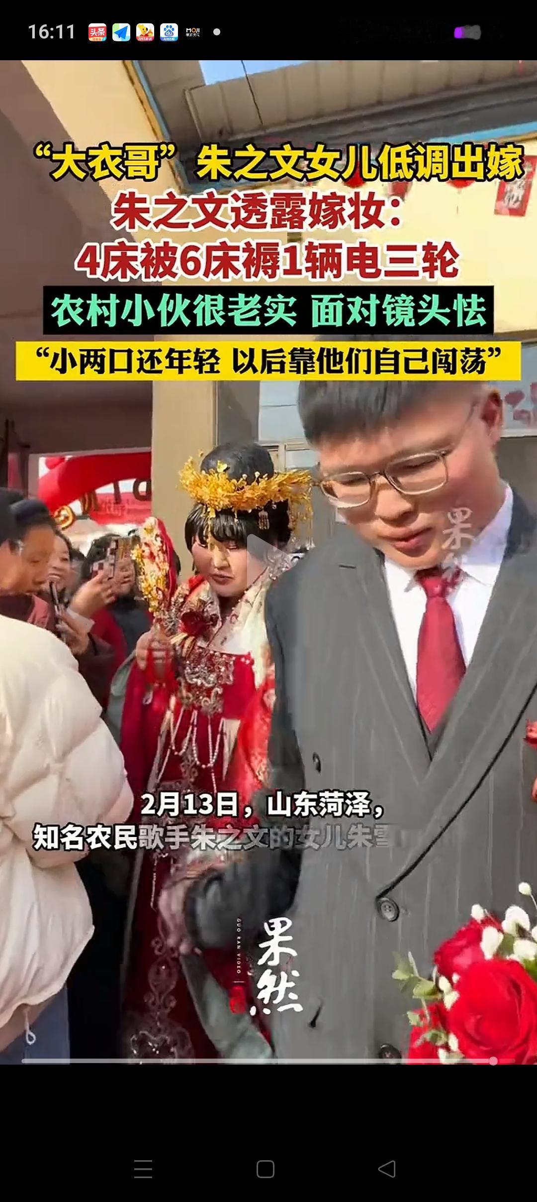 “大衣哥”朱之文透露女儿嫁妆,没有几百万的现金,也没有金银首饰,更没有一辆小汽车,而是: 4床被,6床褥,1辆电三轮。 大衣哥说之所以这么安排,是因为两个人还年轻,未来要靠他们自己去争取。至于女婿当天为什么没笑?他说:因为他有一点紧张,从来没有面对这么多的镜头。 大衣哥的做法太明智了!老人有钱是自己的,如果年轻人想得到什么,就应该自己去赚。要不然他们不知道珍惜,好好过日子。 有这样开明的爸爸妈妈,和实在的老公,相信朱之文女儿在娘家会过得很开心[玫瑰][玫瑰]