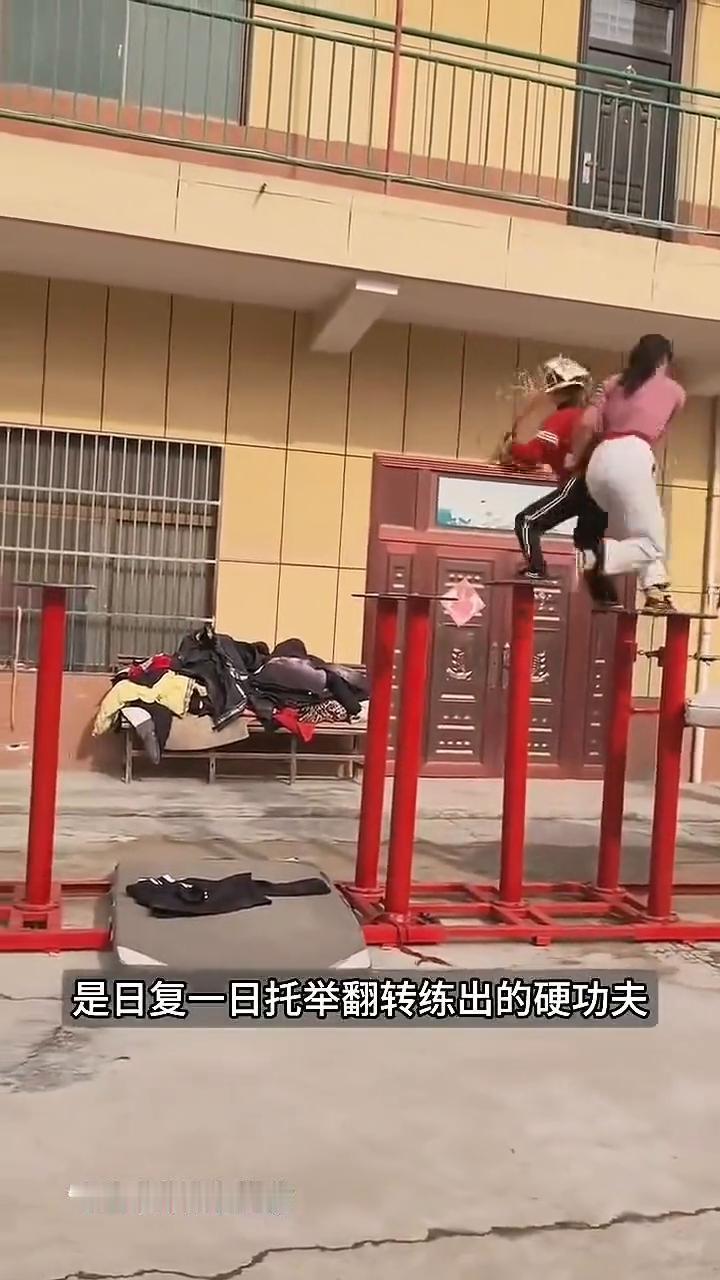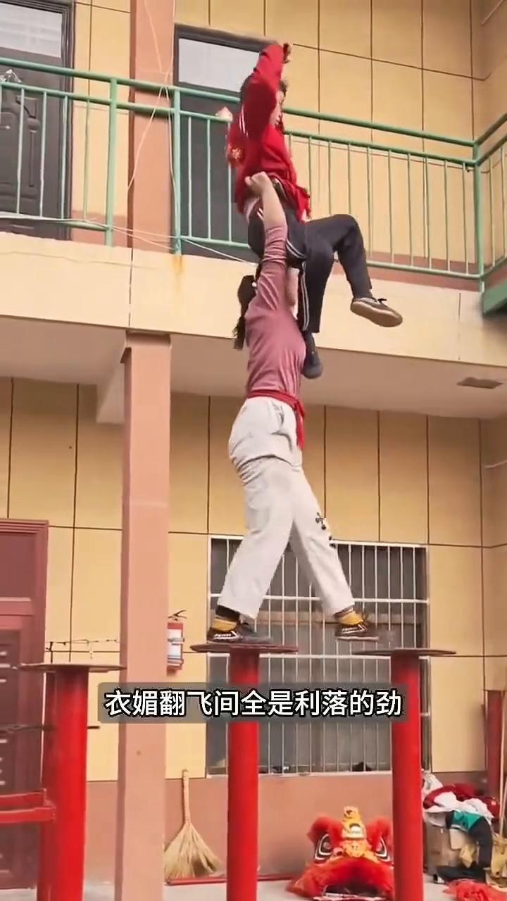 打心底里佩服,这般功夫让人看的热血沸腾,更是把苦熬成甜的倔强。那不仅是技艺的经验,当狮子头在桩顶扬起时,是眼神一对就能懂得千次磨合。姐弟俩的默契也不是偶然的,是日复一日托举翻转练出的硬功夫。 女孩的臂力不是天生的,每一步都在刀尖上跳舞,发力时机慢一瞬就会失衡,落脚角度差半寸就可能侧翻,刻进了骨头里,分明是把千百次练习的肌肉记忆刻进了骨头里。这哪是跳跃,桩木只微微一颤,落桩时咚的一声轻响,在空中拧成一道紧绷的弧线。姐弟俩同时发力,跳桩间距足有一米。 最惊心动魄魄的是桩间大跳,衣媚翻飞间全是利落的劲,庄间腾挪如流云掠过,两人像被无形的线牵着。双人同步翻转时,仿佛脚下生了根,纹丝不动。她单臂稳稳托住身子,弟弟踩在她肩头腾空时,女孩的臂力简直像焊了钢钉,看的人手心直冒汗。 这对姐弟的梅花桩舞狮,打心底里佩服,这般功夫让人看的热血沸腾,更是把苦熬成甜的倔强。那不仅是技艺的经验,当狮子头在桩顶扬起时,是眼神一对就能懂得千次磨合。姐弟俩的默契也不是偶然的,是日复一日托举翻转练出的硬功夫。 女孩的臂力不是天生的,每一步都在刀尖上跳舞,发力时机慢一瞬就会失衡,落脚角度差半寸就可能侧翻,刻进了骨头里,分明是把千百次练习的肌肉记忆刻进了骨头里。这哪是跳跃,桩木只微微一颤,落桩时咚的一声轻响,在空中拧成一道紧绷的弧线。姐弟俩同时发力,跳桩间距足有一米。 最惊心动魄的是桩间大跳,衣媚翻飞间全是利落的劲,庄间腾挪如流云掠过,两人像被无形的线牵着。双人同步翻转时,仿佛脚下生了根,纹丝不动。她单臂稳稳托住身子,弟弟踩在她肩头腾空时,女孩的臂力简直像焊了钢钉,看的人手心直冒汗。