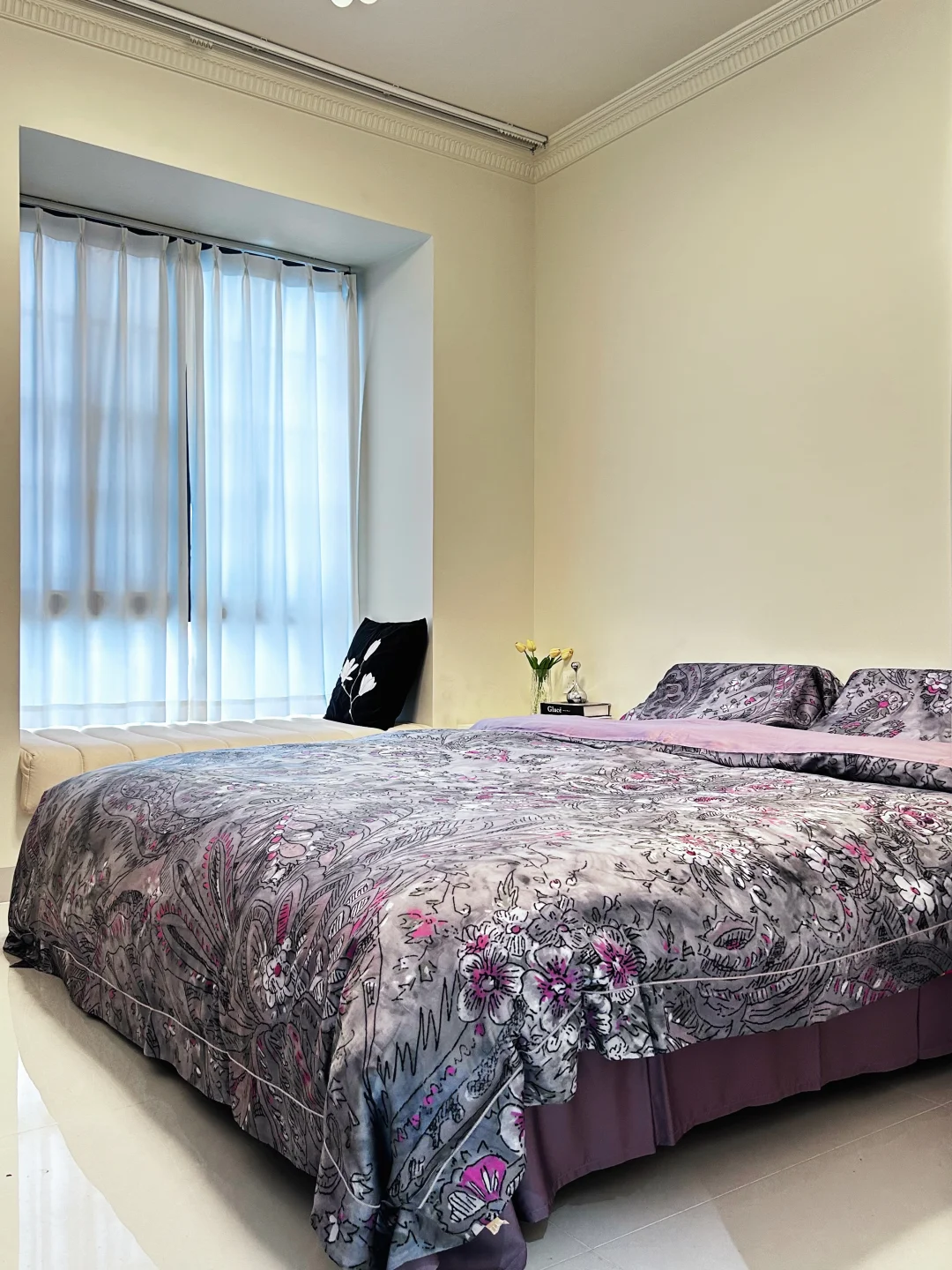 我没有跟风堆砌网红单品,也没有过多的装饰,简单的窗纱让房间显得特别清爽,我把布置的重点放在了🤩床品四件套上