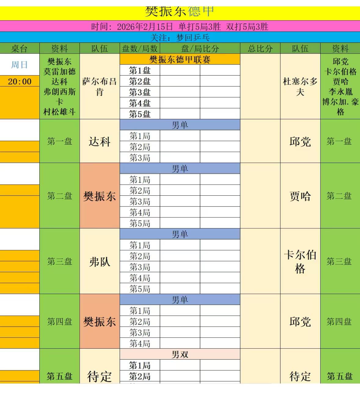 2月15日樊振东德甲的对阵预测来了—樊振东VS邱党 今天晚上8点, 德甲联赛第十七轮, 萨尔布吕肯VS杜塞尔多夫, 杜塞尔多夫的阵容非常强大, 邱党,贾哈和安东卡尔伯格, 预测樊振东对阵贾哈和 邱党。 邱党在采访中表示, 自己会针对樊振东做出训练计划, 可谓有备而来啊! 樊振东加油, 我觉得还是让樊振东打二单, 出其不意 攻其不备! 今晚的比赛时间非常友善, 终于不用熬夜了, 这也是樊振东最近的最后一场比赛, 年前最后一场比赛, 打完后, 又要等一个多月啦! 樊振东打完这场比赛, 会赶回来陪父母一起过大年吧, 估计到家也就大年初二啦, 今晚东哥加油, 打爆一切!