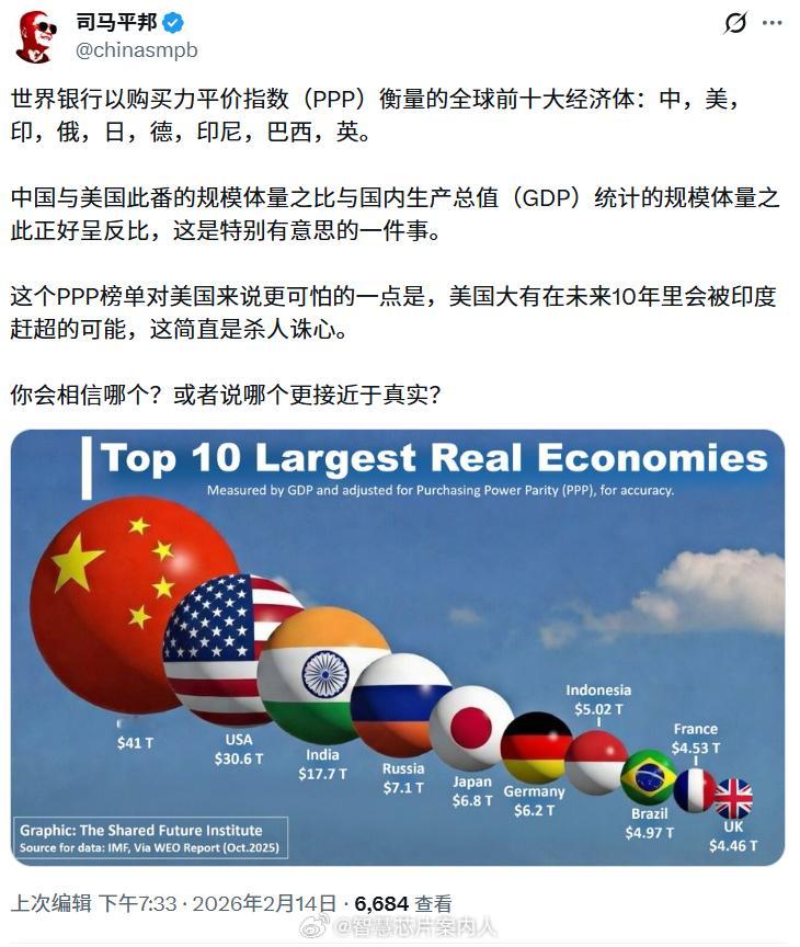 转X上一个博主的信息。世界银行根据购买力平价(PPP)排出全球前10大经济体。