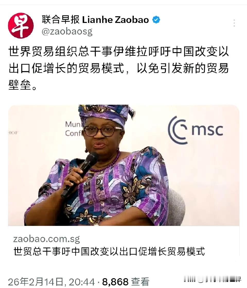 2月13日,尼日利亚籍世贸组织总干事劝说中国改变贸易模式,以免引发新的贸易壁垒。